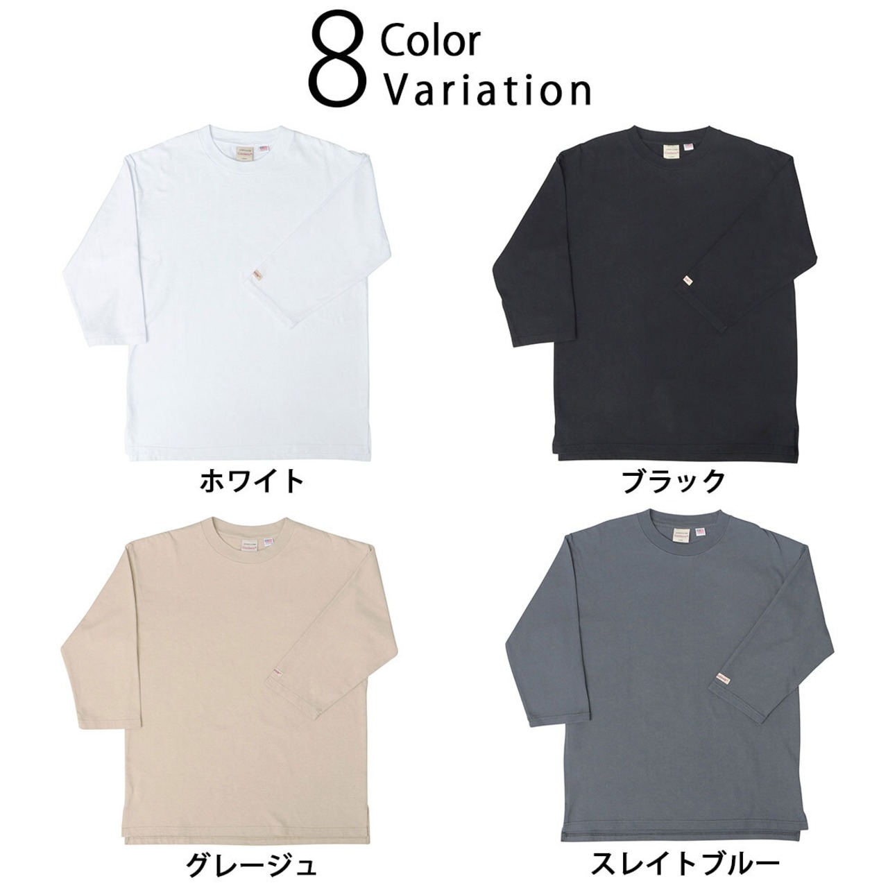 GoodwearのUSAコットンを使用した、ヘビーウェイトな7分袖Tシャツ。USAコットンならではの、タフな7.6オンスの肉厚生地は、洗いをかけてUSED感を演出。着こむ程に味が出る独特の風合いと、ヘタレにくい肉厚ボディは長く着用いただけます。裾のサイドスリットや、袖のロゴワッペンなど、無地のアウトウェアとして1枚で着てもサマになる拘りデザイン。トレンドに振り回されないレギュラーシルエットで、長く愛用していただける定番アイテムの1枚になること間違いなし。