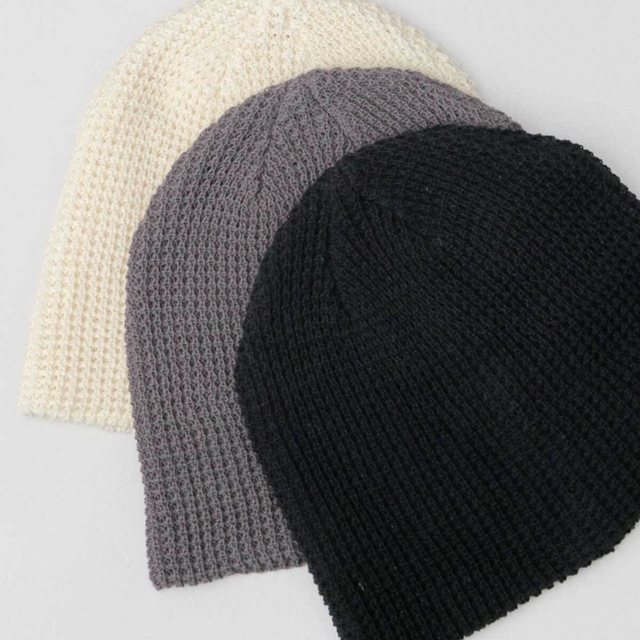 装飾の無い、シンプルな無地デザインのシングルビーニー。優しい凹凸感のあるワッフル生地を二重仕様にした、タイト過ぎず、緩すぎない、絶妙なフィット感がポイント。シングルビーニーとしてはもちろん、折り返してスタンダードなニット帽としても◎平行に被ったり、斜めにずらしたり、被り方もスタイルに合わせて楽しめます。普段使いはもちろん、タウンユースやアウトドアシーンにもおすすめ。