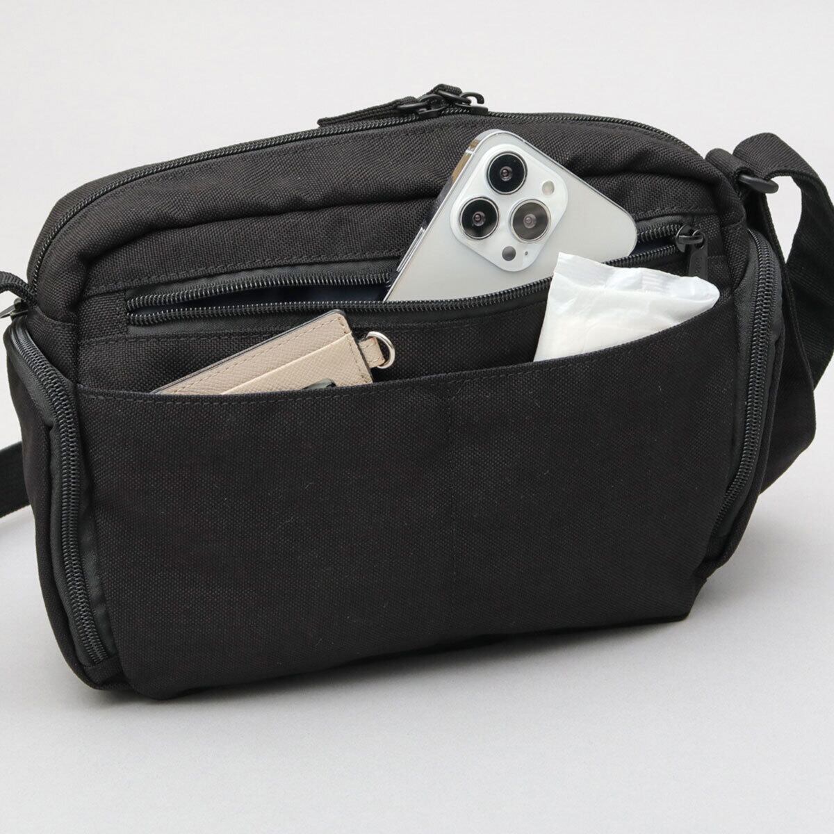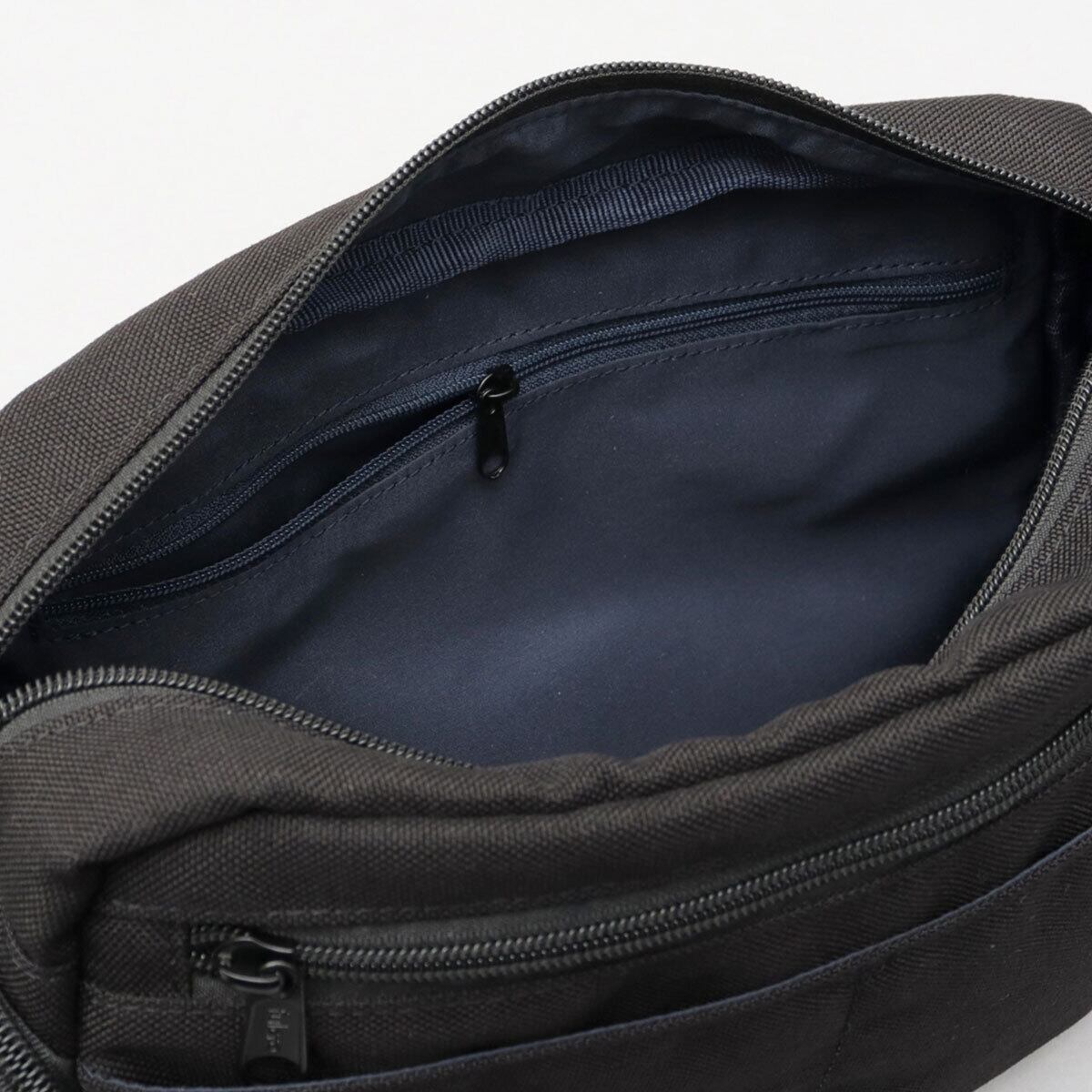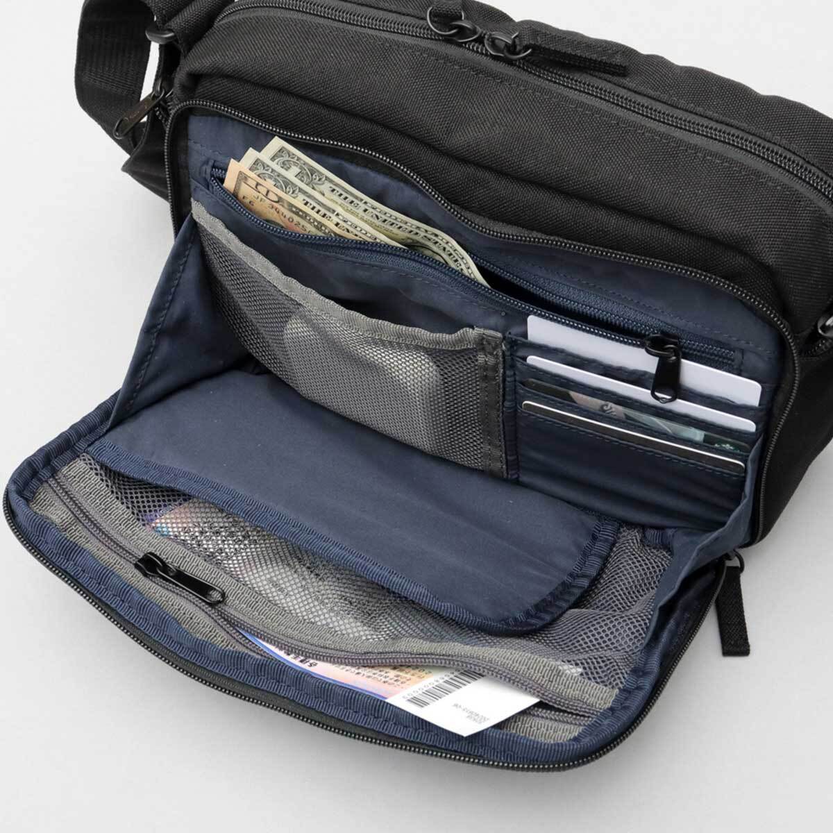 メイン収納スペースは、A5サイズがゆったり収まるサイズ感。長財布やポーチなど、いつものお出掛けに持ち歩くアイテムがしっかり収納可能。内側には、視認性の良いメッシュポケット、ファスナー付きメッシュポケット、仕分けに便利なファスナーポケットを完備。