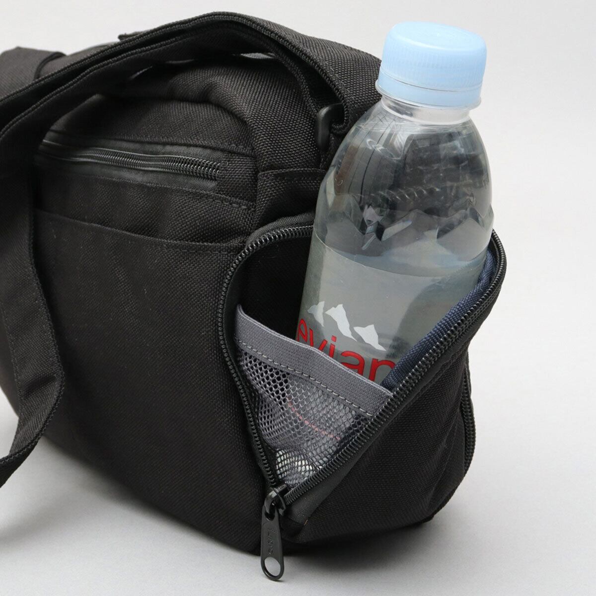 両サイドには、ファスナーポケットを配置。細かいアイテムの収納にはもちろん、間口を開けてボトルポケットとしての使用も◎