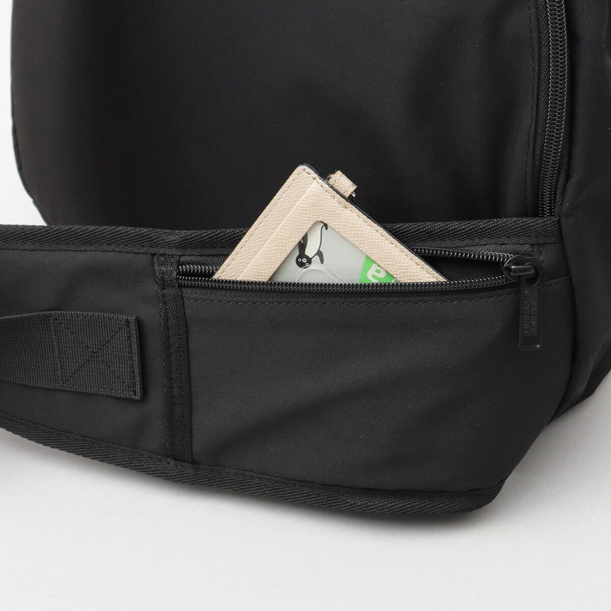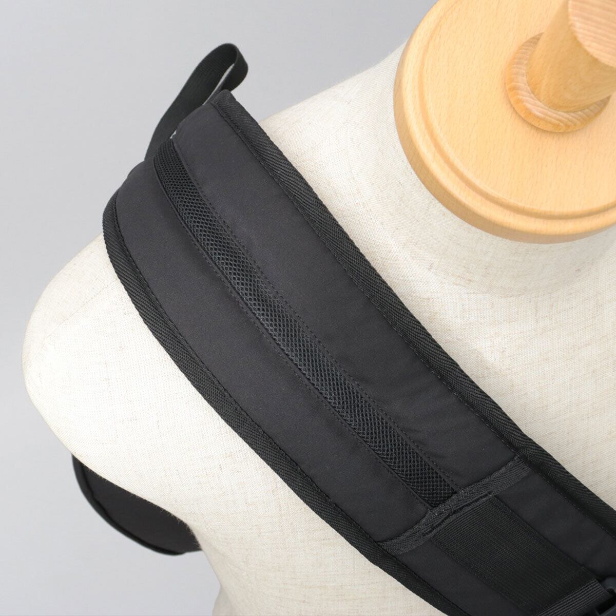 片掛けのショルダーベルトは、幅広の設計で背負いやすく、肩への負担を軽減。バックルで簡単に着脱が可能。中央部分をエアメッシュにすることで、重さの軽減に加え、体温をしっかり逃がし蒸れにくい、完全オリジナル仕様の高機能ショルダーに。パスケースなどの収納に便利なファスナーポケットを配置。