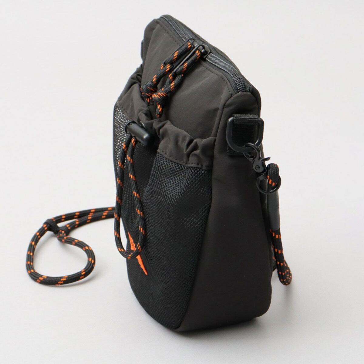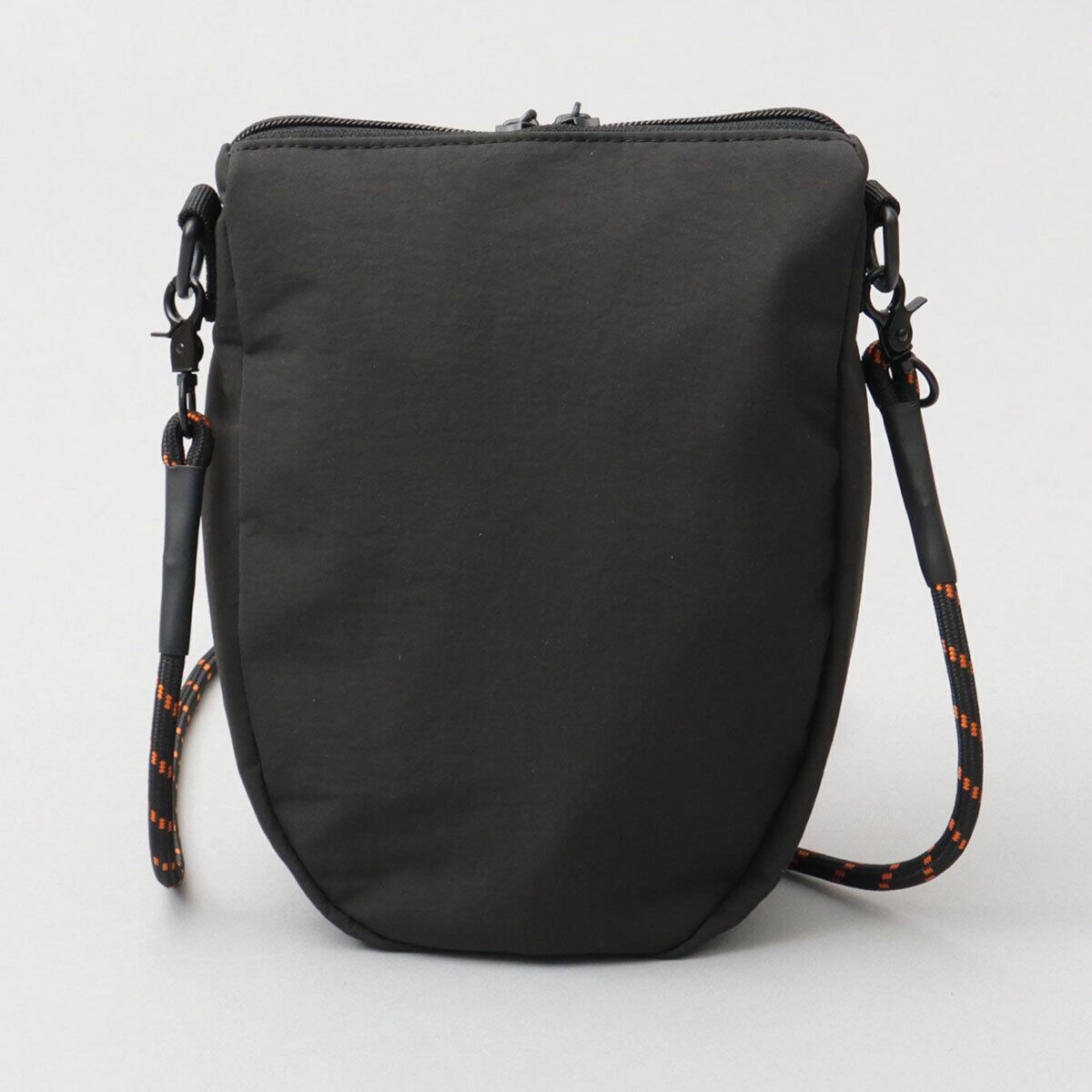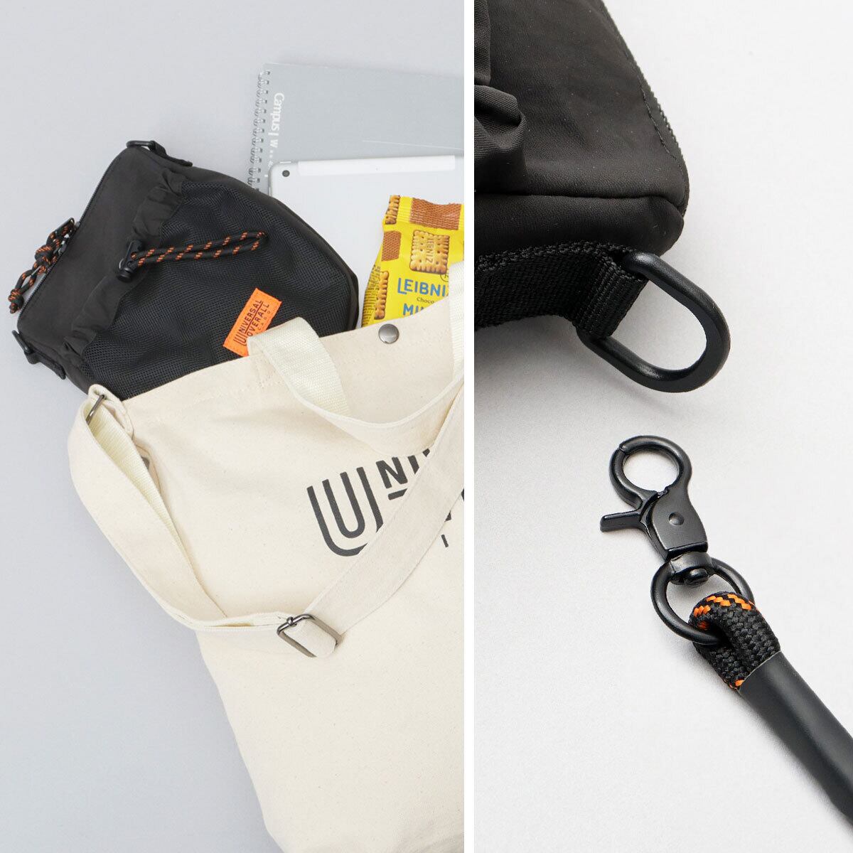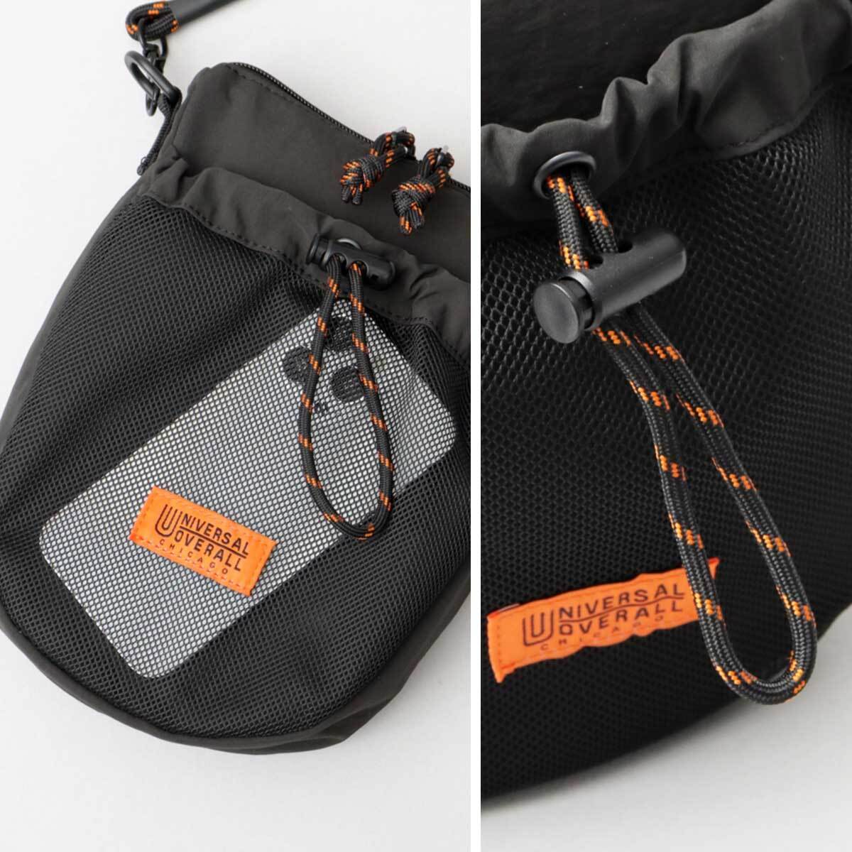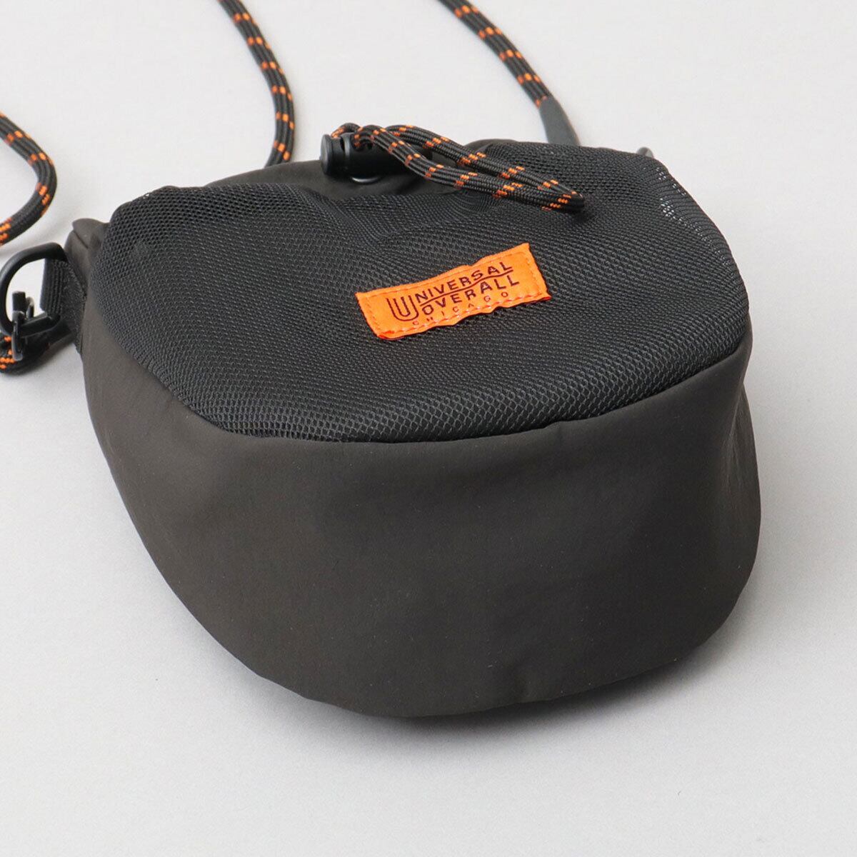 各所に配置されたオリジナルザイルコードやフロントメッシュポケットなど、“UNIVERSAL OVERALL”らしさ溢れる、半月型ショルダーバッグ。フロントに配置された、オレンジのブランドネームタグがワンポイントに。