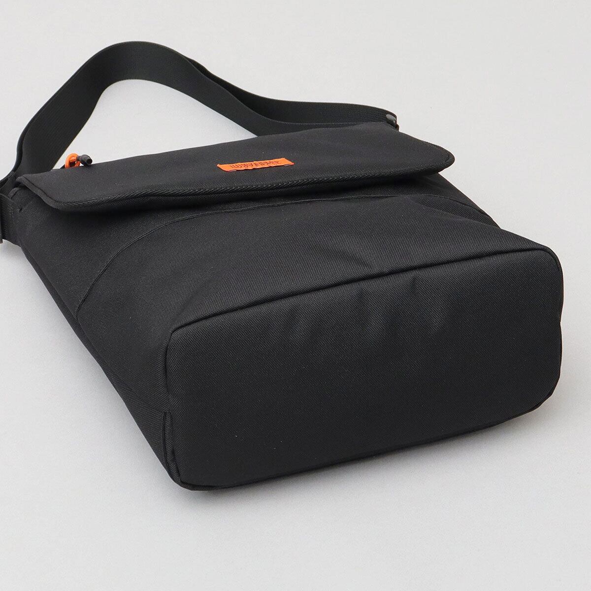 ありそうでなかった、すっきり縦型シルエットのメッセンジャーバッグ。フロントに配置された、オレンジのブランドネームタグがシンプルなデザインのワンポイントに。