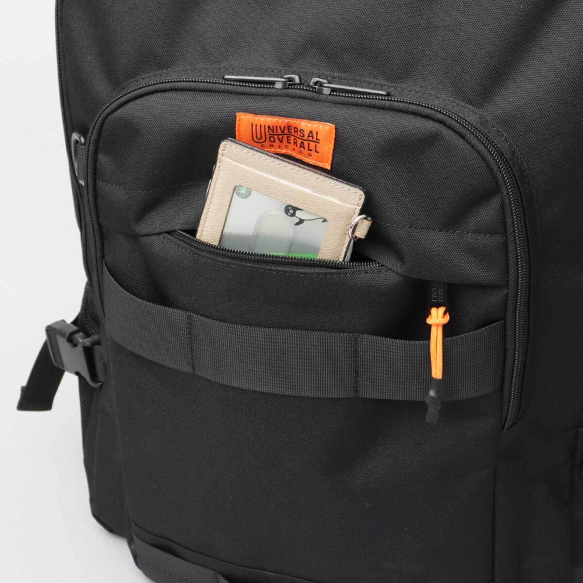 老舗ワークウェアブランド“UNIVERSAL OVERALL(ユニバーサルオーバーオール)”のバックパック。フロントのテープ使いがワークブランドらしいデザイン。たっぷり大容量サイズのボディに、PCスリーブやフロントポケットなど、バッグ内外に整頓に便利なポケットを完備。収納スペースはB4サイズまでゆったり収まる広々としたスペースが、用途に合わせて使い分けができる2層式構造。両サイドには、容量の調節が可能なコンプレッションベルトを配置。デイリー使いにはもちろん、荷物が多くなりがちなスクールやレジャー・アウトドアなど、幅広いシーンで活躍すること間違いなし◎