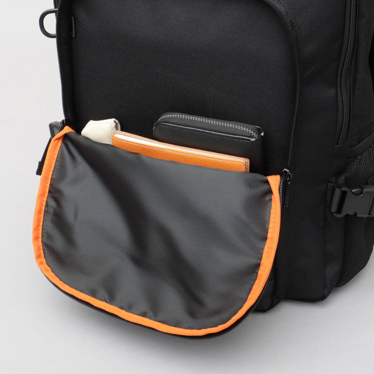 各ファスナーには、ブランドロゴデザインのオリジナルパーツを使用。大きめで引きやすく、スムーズに開閉が可能。収納スペース1層目、フロント外側ポケットに配置されたオレンジのコードがアクセントに◎