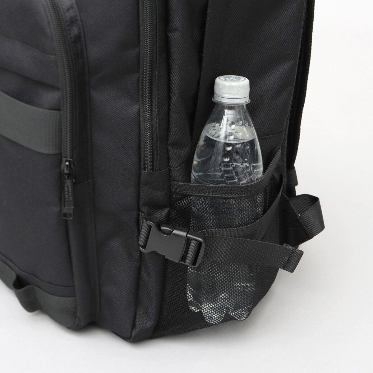 両サイドにはペットボトルや折り畳み傘などの収納に便利な、間口の伸縮するメッシュポケットを配置。