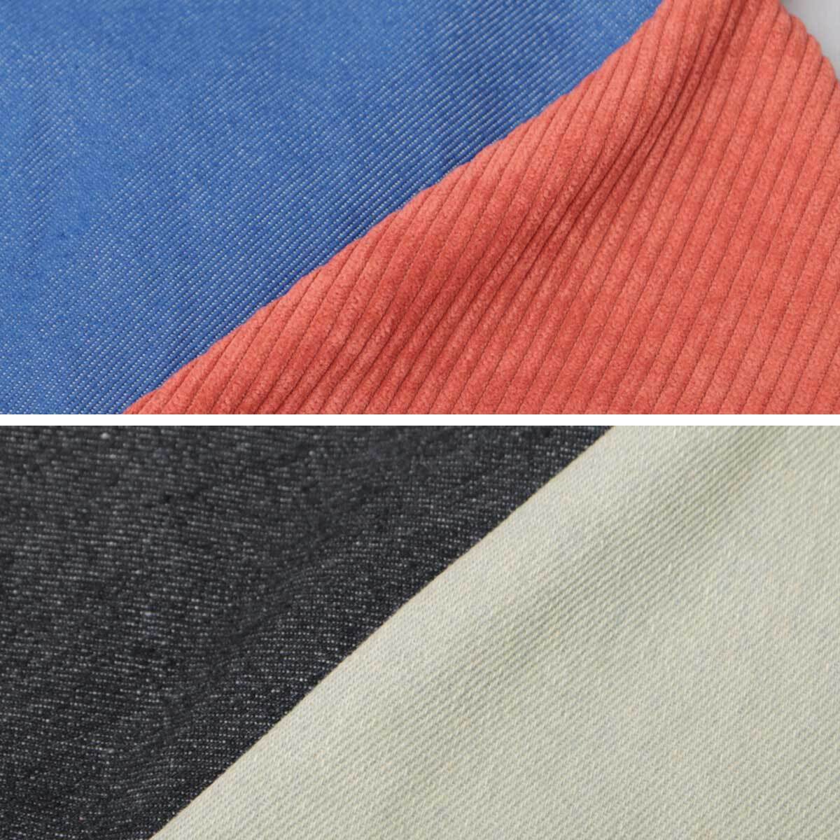 キャラクターデザインには、しっかり厚手のツイル生地をベースに、コーデュロイ生地をアクセントに使用。ミックスデザインには、ブラック・ブルー・ライトブルーのカジュアルなデニム生地と太い畝のコーデュロイ生地を使用。