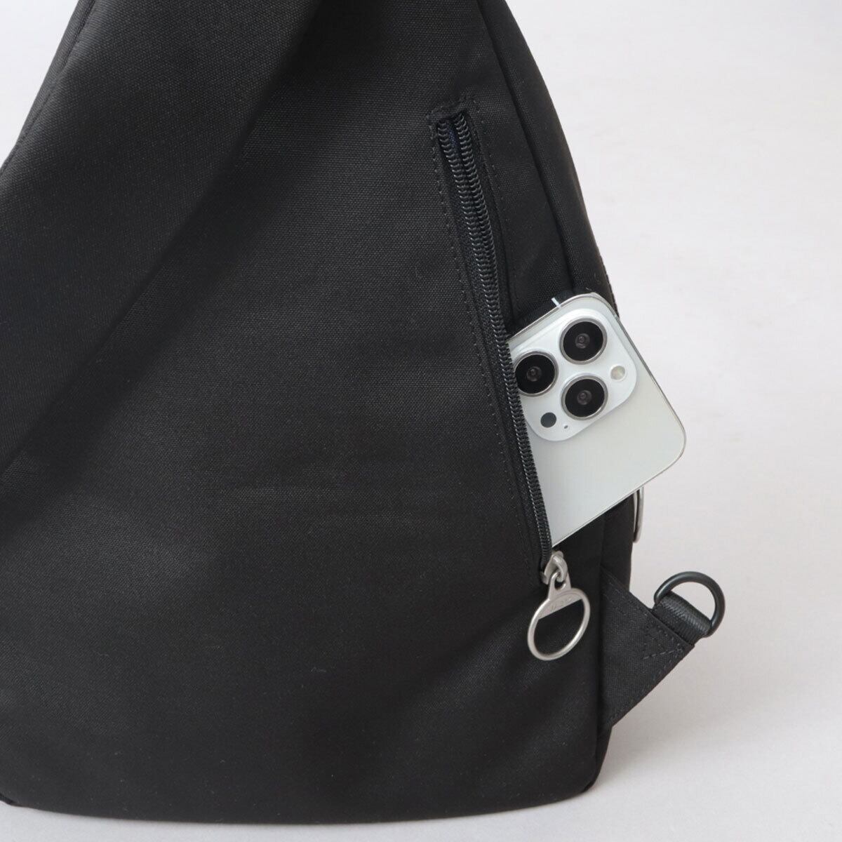 背面には、ファスナーポケットを配置。お財布やスマートフォンを収納して、セキュリティポケットとしての使用もおすすめ。