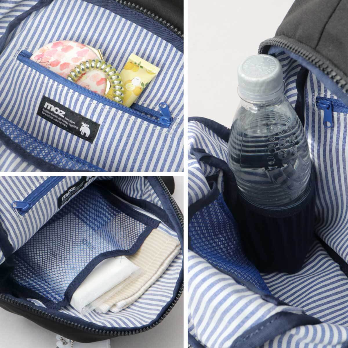 内側には、仕分けに便利なファスナーポケットと視認性の良いメッシュポケットに加え、ブランドキャラクターの”エルク”のイメージに合わせて伸縮する生地を採用した“moz pocket”(モズポケット)を配置。moz pocketには、500mlのペットボトルや水筒を倒さずに収納できる、ボトルホルダーとして便利◎