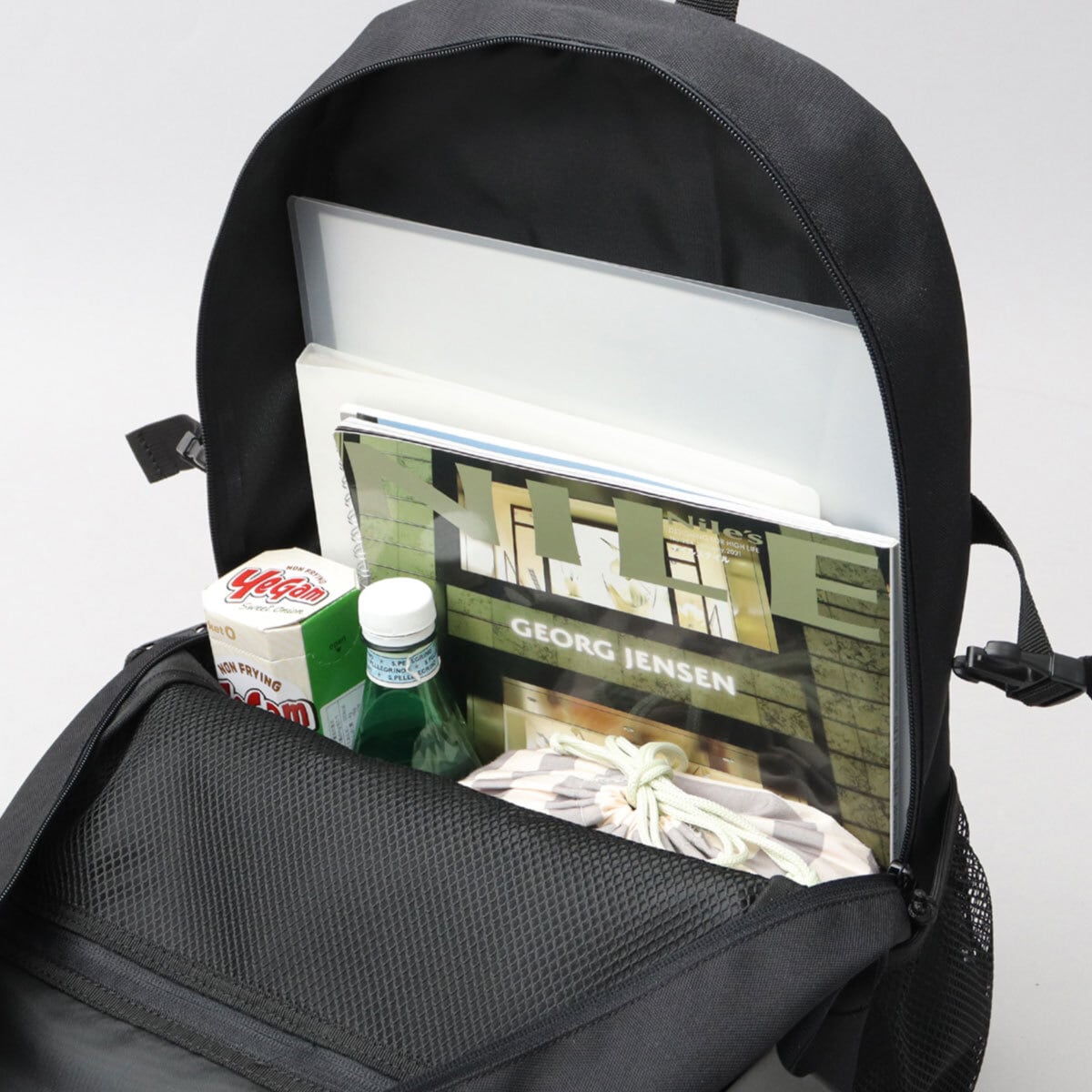 両サイドには、ペットボトルや折り畳み傘の収納に便利なメッシュポケットを配置。間口がゴムになっているので、伸縮性も、荷物へのフィット感も◎