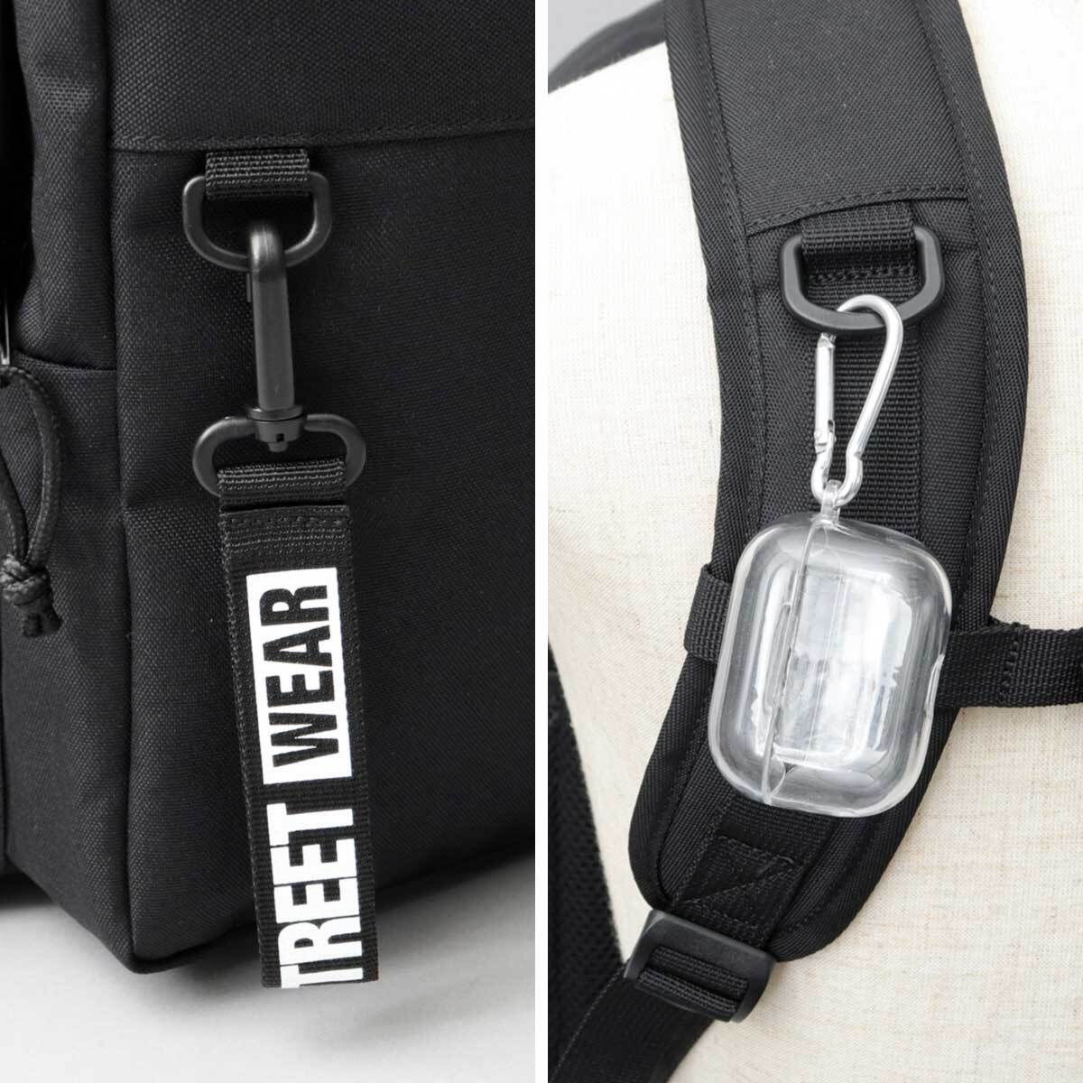 フロントとショルダーベルト部分に計3つのDカンを配置。フロントDカンには、取り外し可能な、ストラップ付き。
