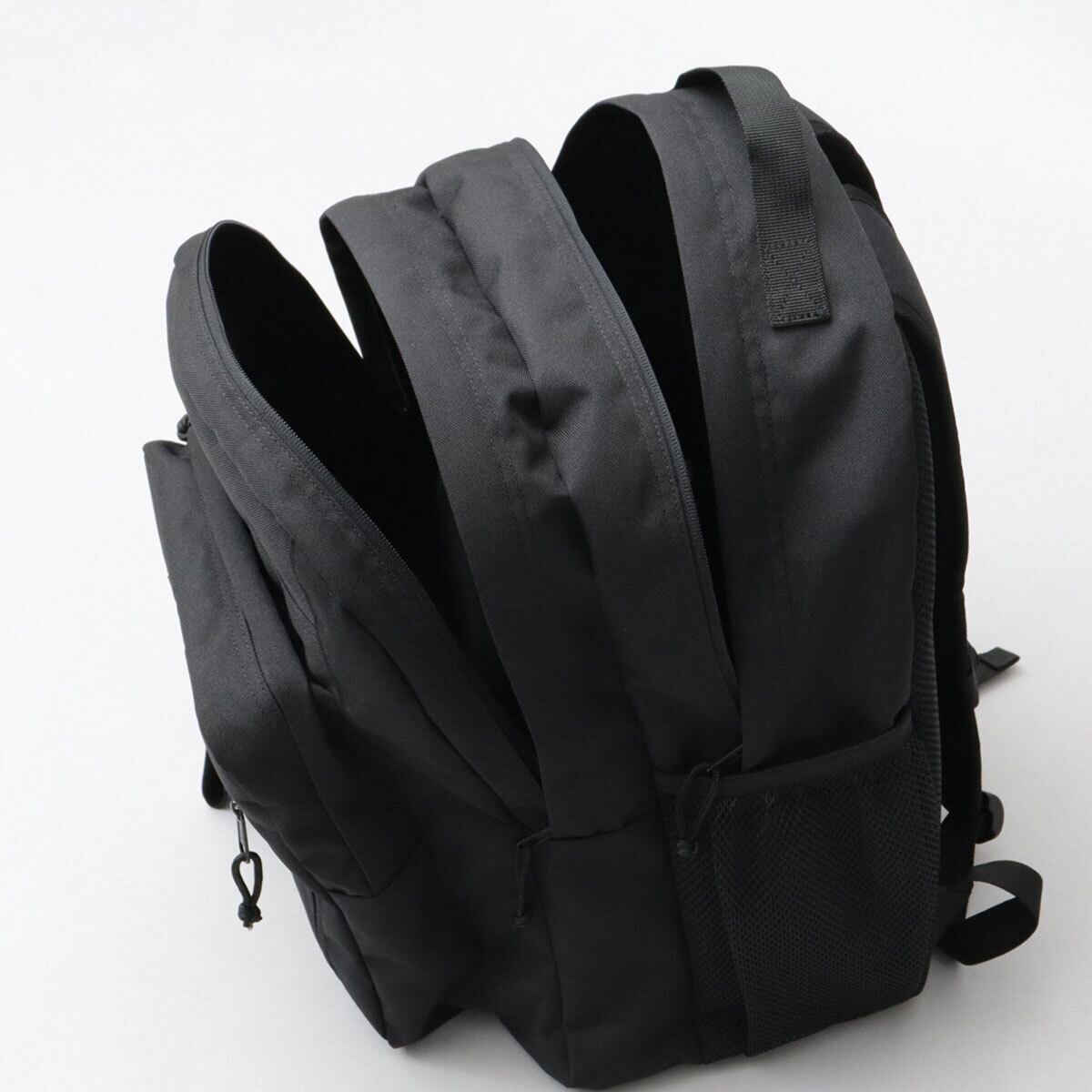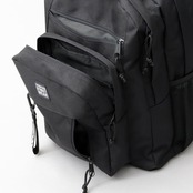 各スペースにしっかりマチ幅をとった、大容量サイズのラウンド型バックパック。フロントのブラックタグがワンポイントに。