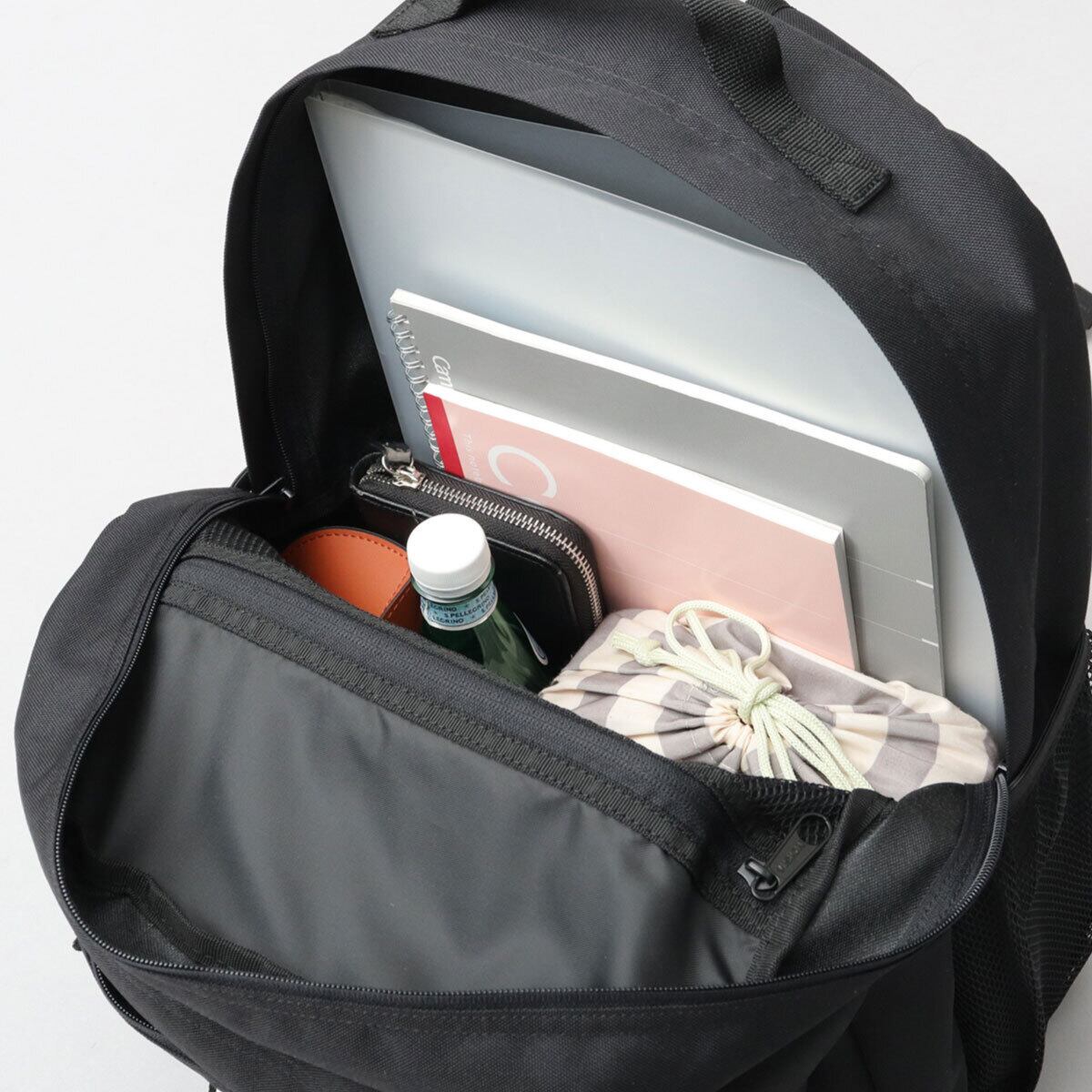 約13.0cmのたっぷりとしたマチ幅で、ランチボックスなどのかさ張る荷物も楽々収納可能。内側には、仕分けに便利なオープンポケットと、細かいアイテムも出し入れしやすい浅めのファスナー付きメッシュポケットを完備。