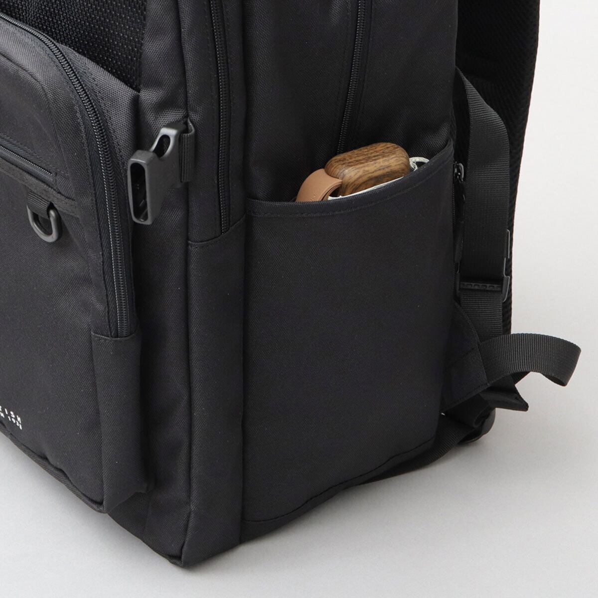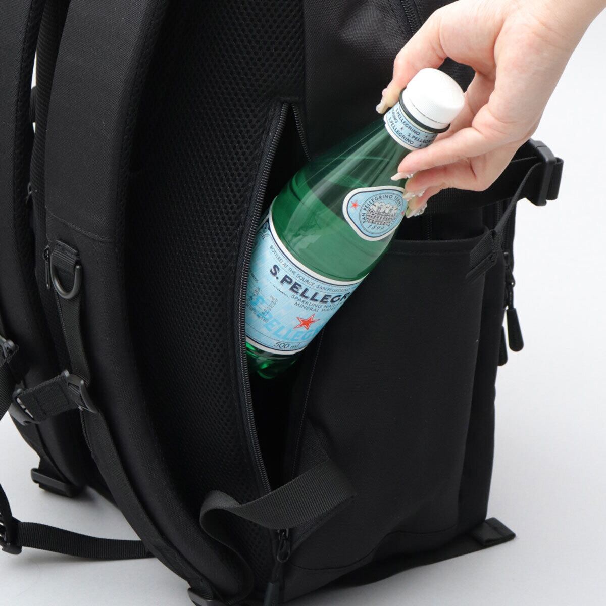 バッグの両サイドには、ペットボトルや折り畳み傘の収納に便利なオープンポケットを配置。