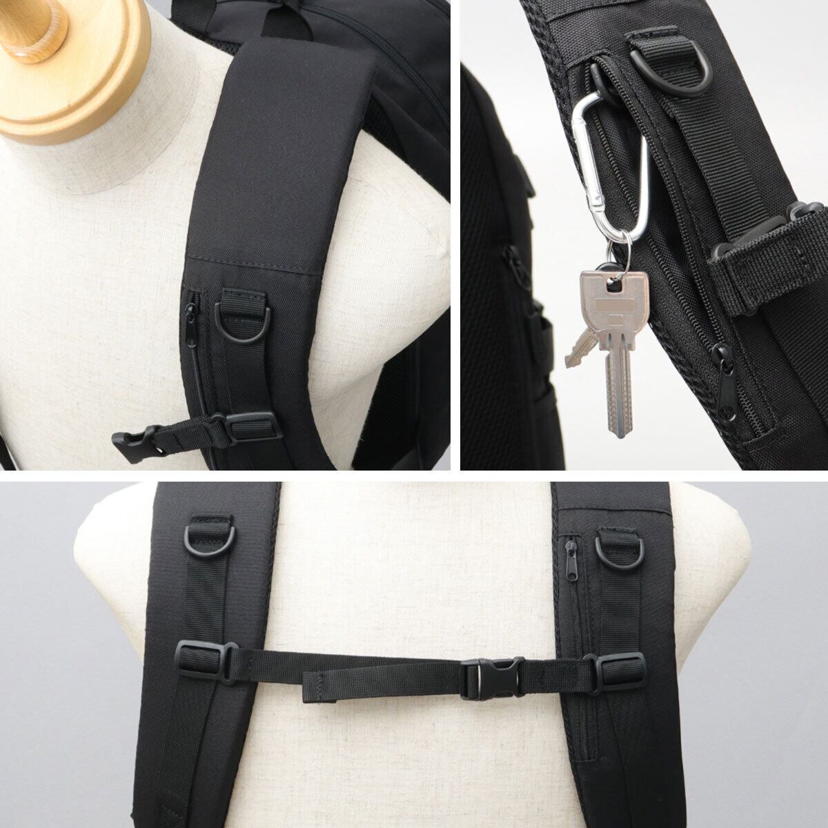 ショルダーベルトは幅広の設計で背負いやすく、肩への負担を軽減。上下に位置調節が可能なハーネスを完備しているので、しっかり固定できます。左ショルダーベルトに、ファスナーポケットを配置。内側には、鍵などの取り付けが可能なDカンが付属。