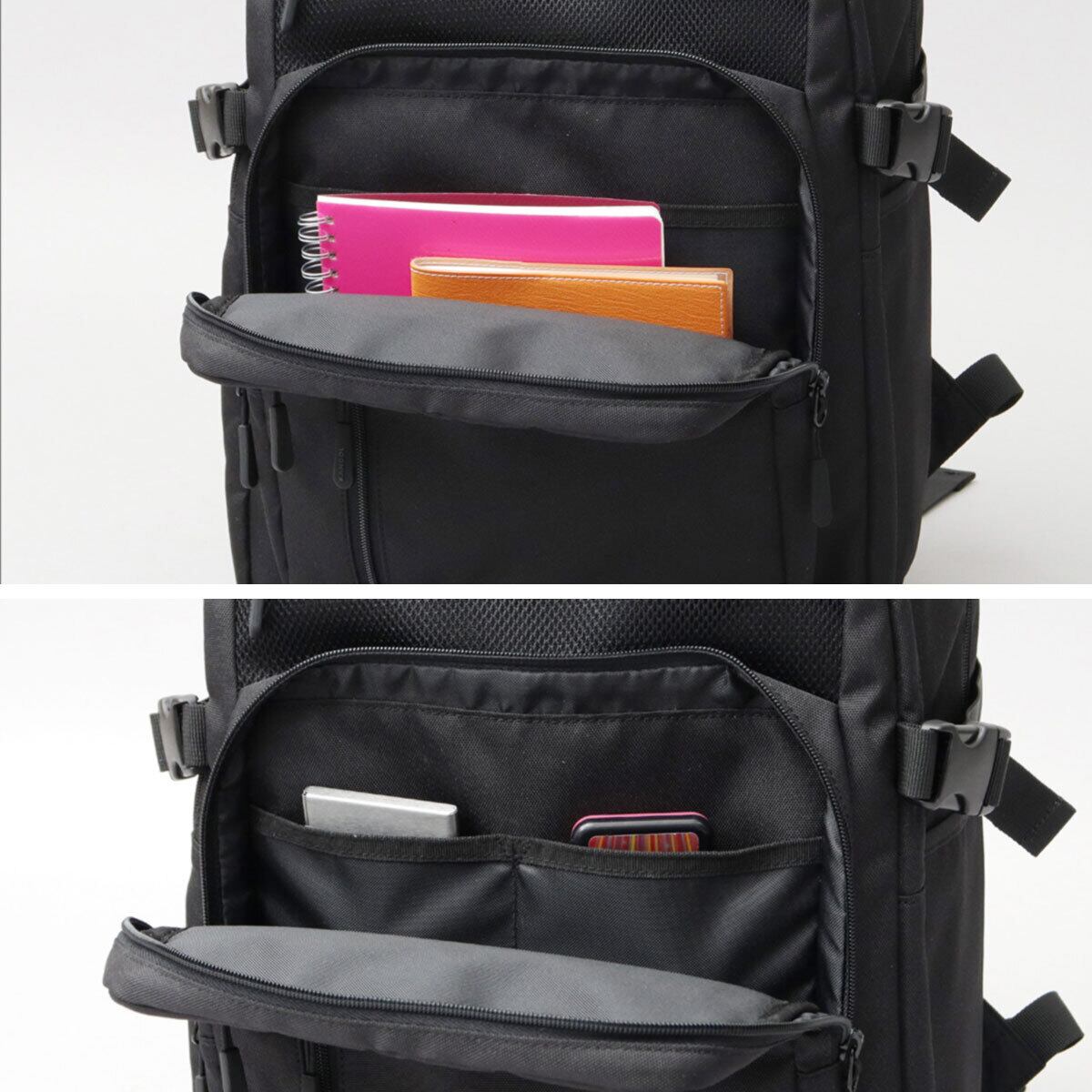 フロント上部には、視認性の良いファスナー付きメッシュポケットを配置。下部には、A5サイズがすっぽり収まる、立体感のあるファスナーポケットを配置。下部ポケット内側には、仕分けに便利なオープンポケット×2を完備。外側には、サッと取り出したい小物の収納に便利なファスナーポケット×2を配置。