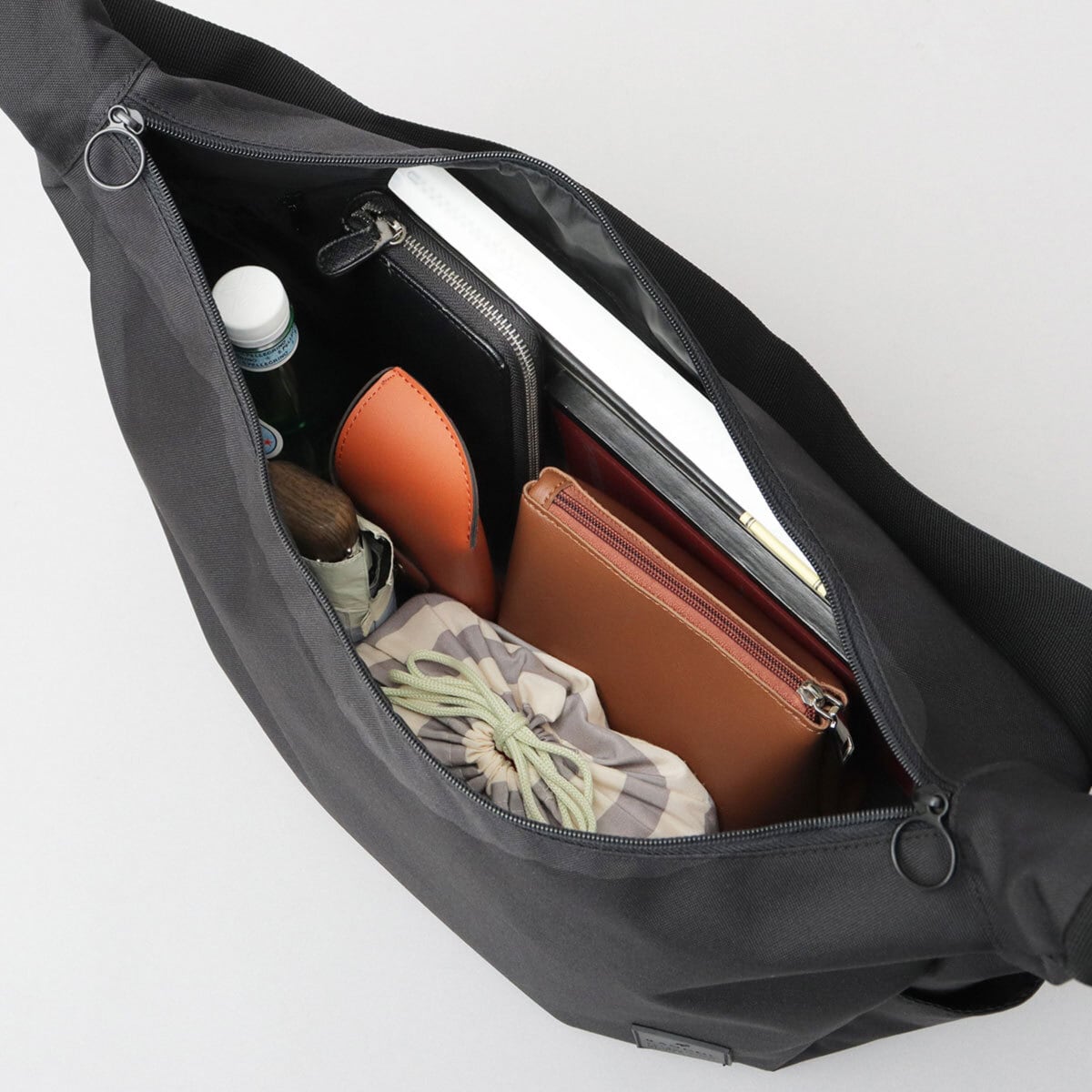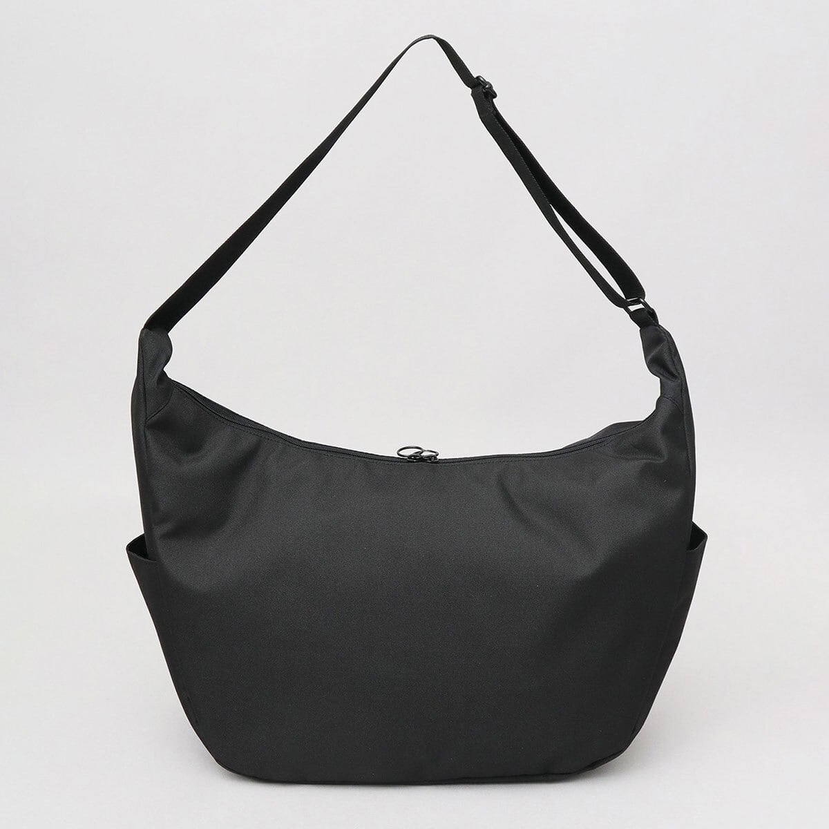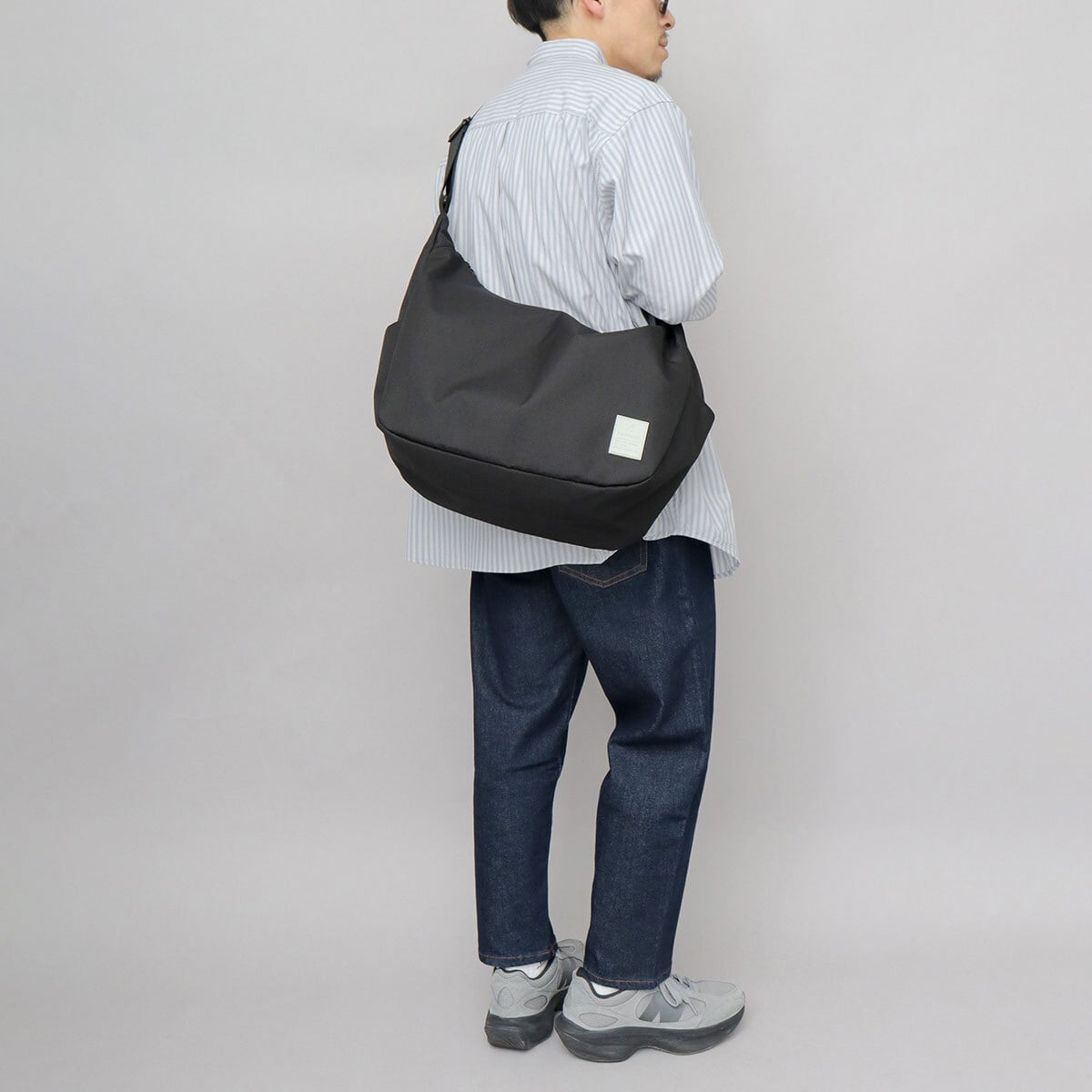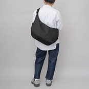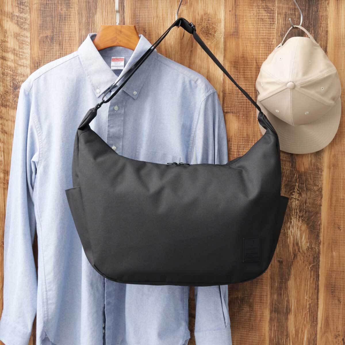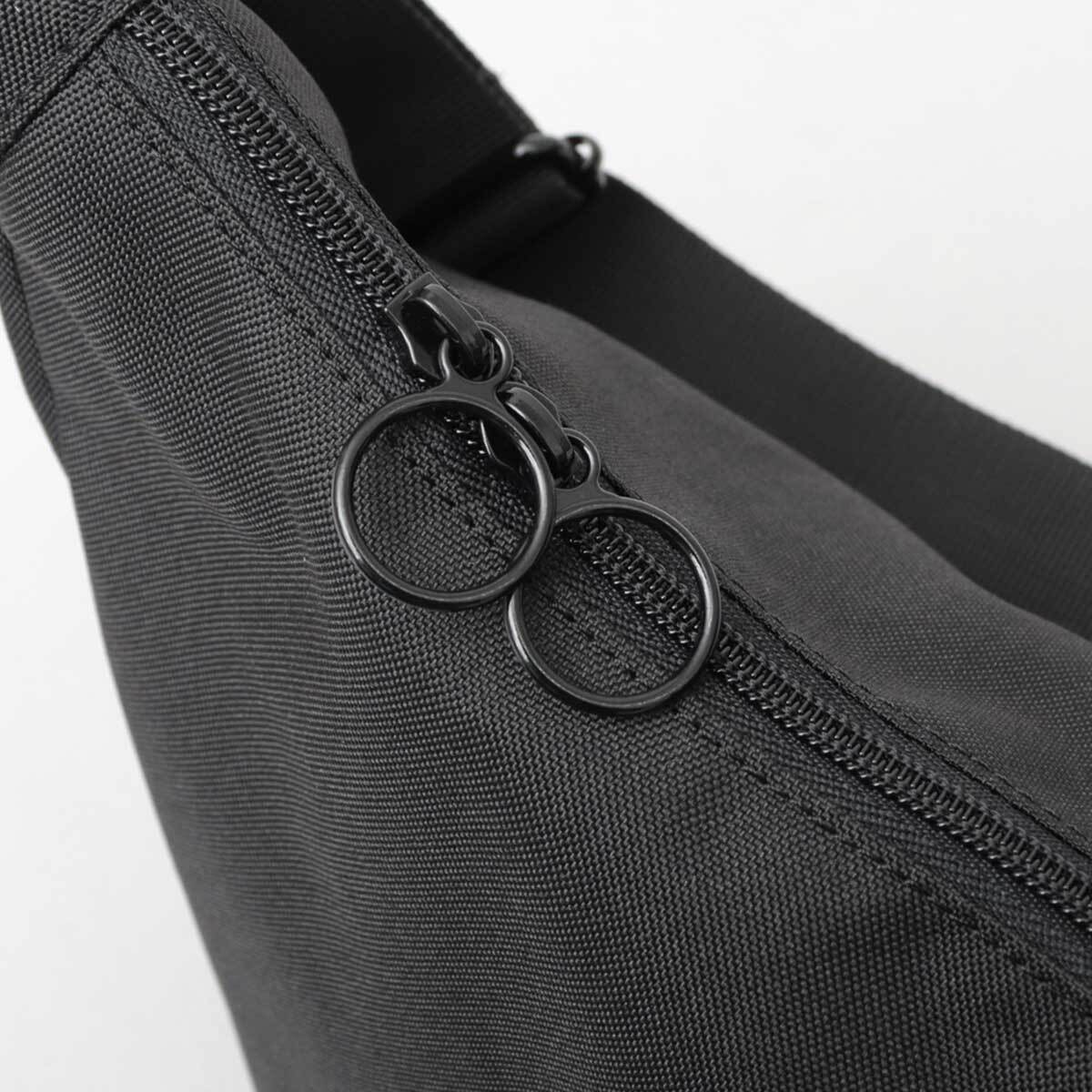 付属パーツやステッチを極力使用しない、ミニマルデザインのショルダーバッグ。底マチを広く取った舟形フォルムのボディに、サイドに配置されたラバータグがワンポイント。