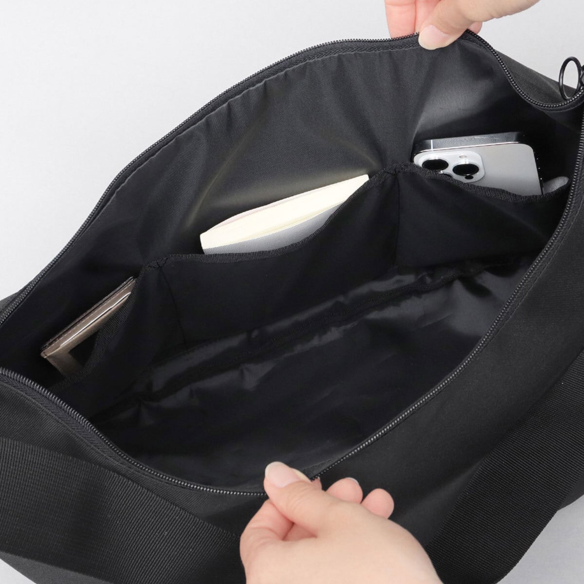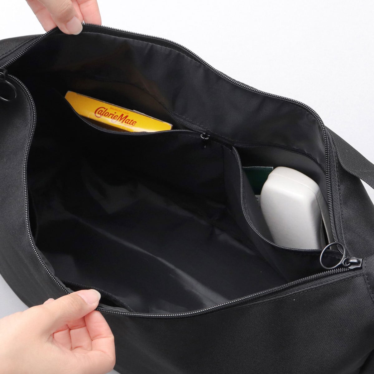 収納スペース内側には、仕分けに便利なファスナーポケット×2とオープンポケット×3を完備。ざっくり荷物が入れられるシンプル設計ながらも、細かいアイテムもしっかり整頓して持ち運びが可能◎