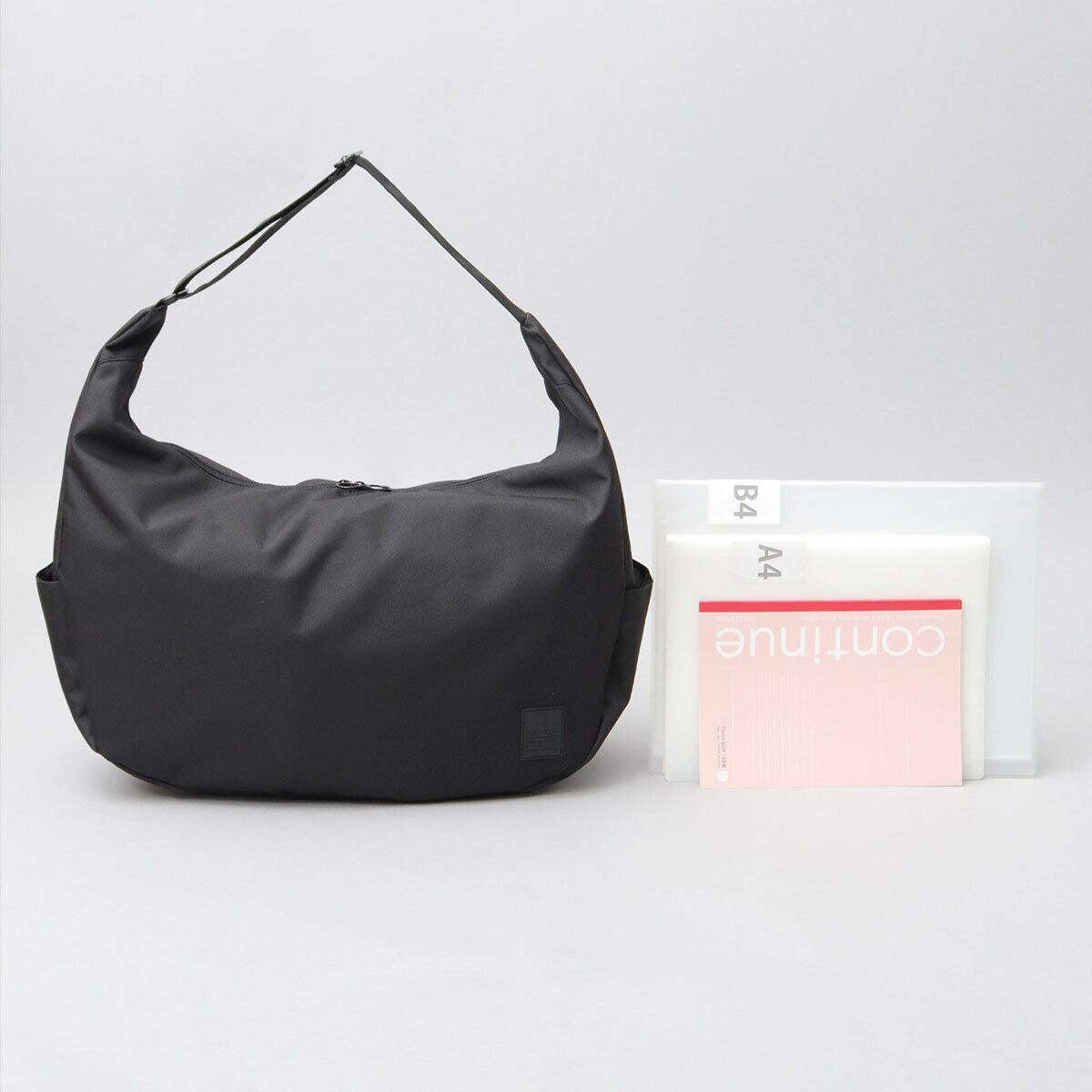 収納スペースは、A4サイズはもちろん、B4サイズも楽に収まる、大容量サイズ。マチをたっぷり取っているので、ランチボックスやポーチなど、かさ張る荷物も収納可能。