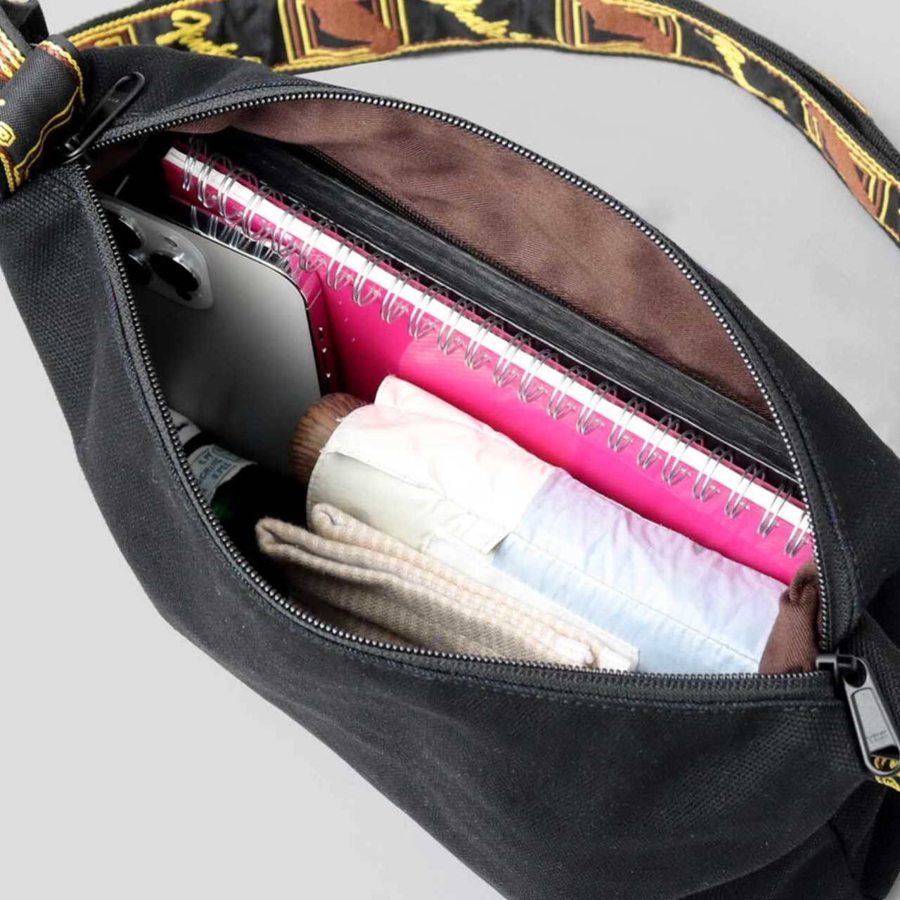 メイン収納スペースは、A5サイズがゆったり収まるデイリー使いにぴったりのサイズ感。内側には、仕分けに便利なファスナーポケットとオープンポケット×2を完備。