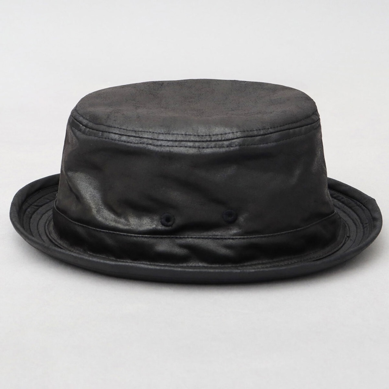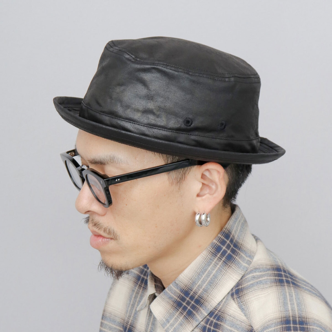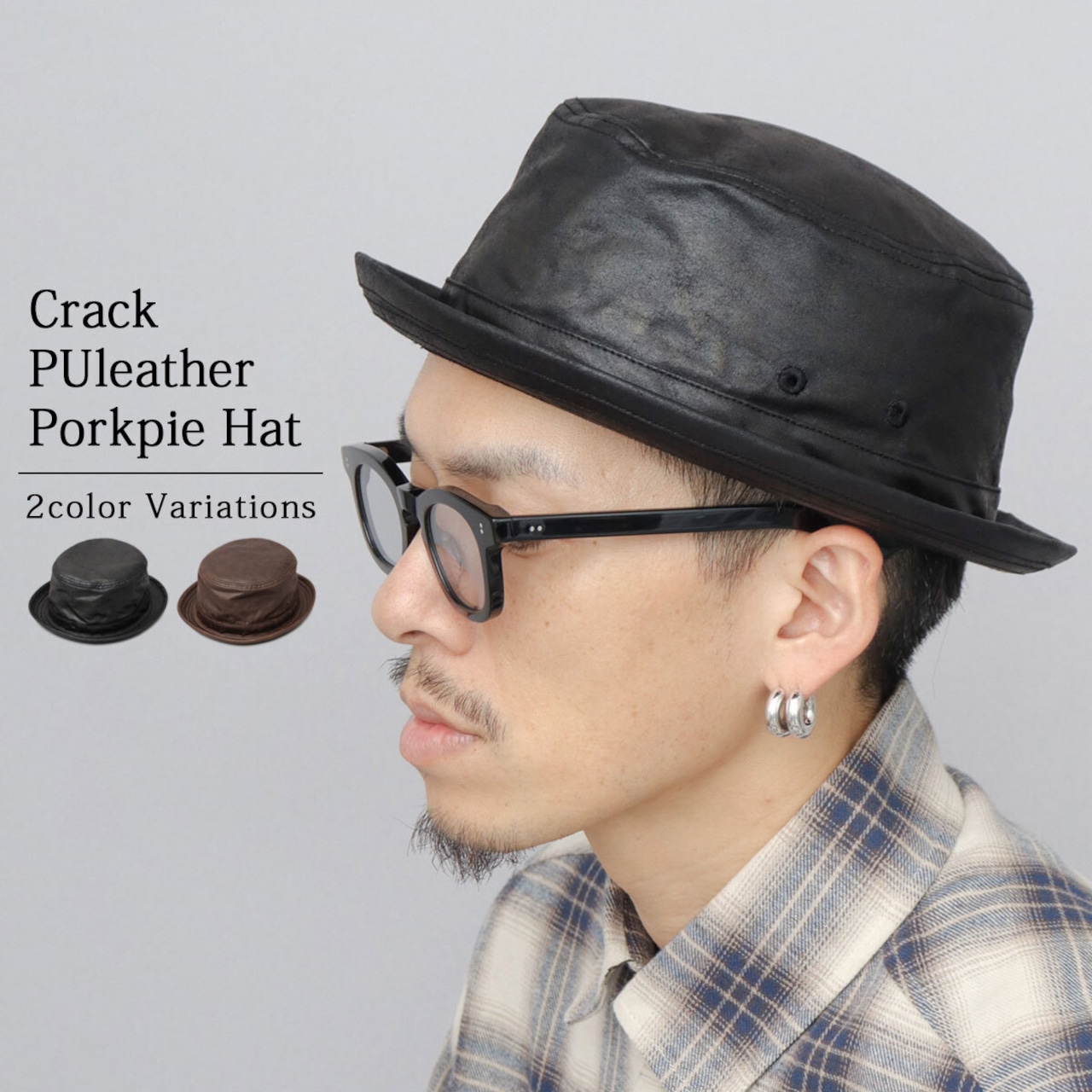 イギリスの料理「ポークパイ」に見た目が似ていることからつけられた名前のポークパイハット。細身ですっきり見える楕円形のクラウンに、お皿の口縁のように上向きになったブリムを合わせたシルエットが特徴。シンプルでベーシックなデザインでありながら、クラック加工を施したヴィンテージライクな合成皮革を使用しているので、カジュアルにも合わせやすく、サッと被るだけで、大人のこなれ感を演出してくれます。カジュアル全般にはもちろん、キレイめスタイルの“外し”やトレンドのストリート系、クラシカルなコーデなど幅広くマッチしてくれます。