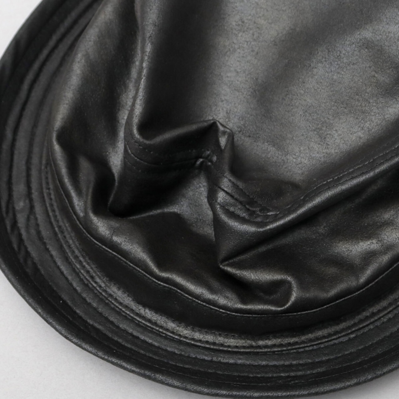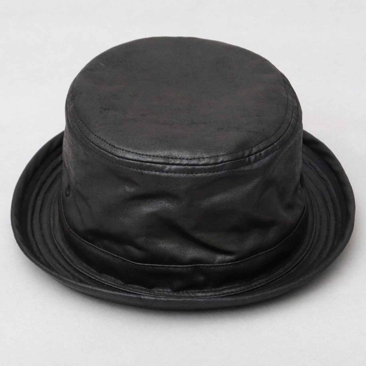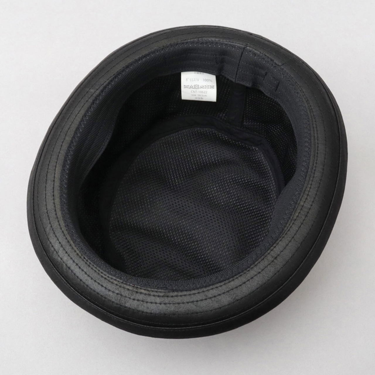 イギリスの料理「ポークパイ」に見た目が似ていることからつけられた名前のポークパイハット。細身ですっきり見える楕円形のクラウンに、お皿の口縁のように上向きになったブリムを合わせたシルエットが特徴。シンプルでベーシックなデザインでありながら、クラック加工を施したヴィンテージライクな合成皮革を使用しているので、カジュアルにも合わせやすく、サッと被るだけで、大人のこなれ感を演出してくれます。カジュアル全般にはもちろん、キレイめスタイルの“外し”やトレンドのストリート系、クラシカルなコーデなど幅広くマッチしてくれます。