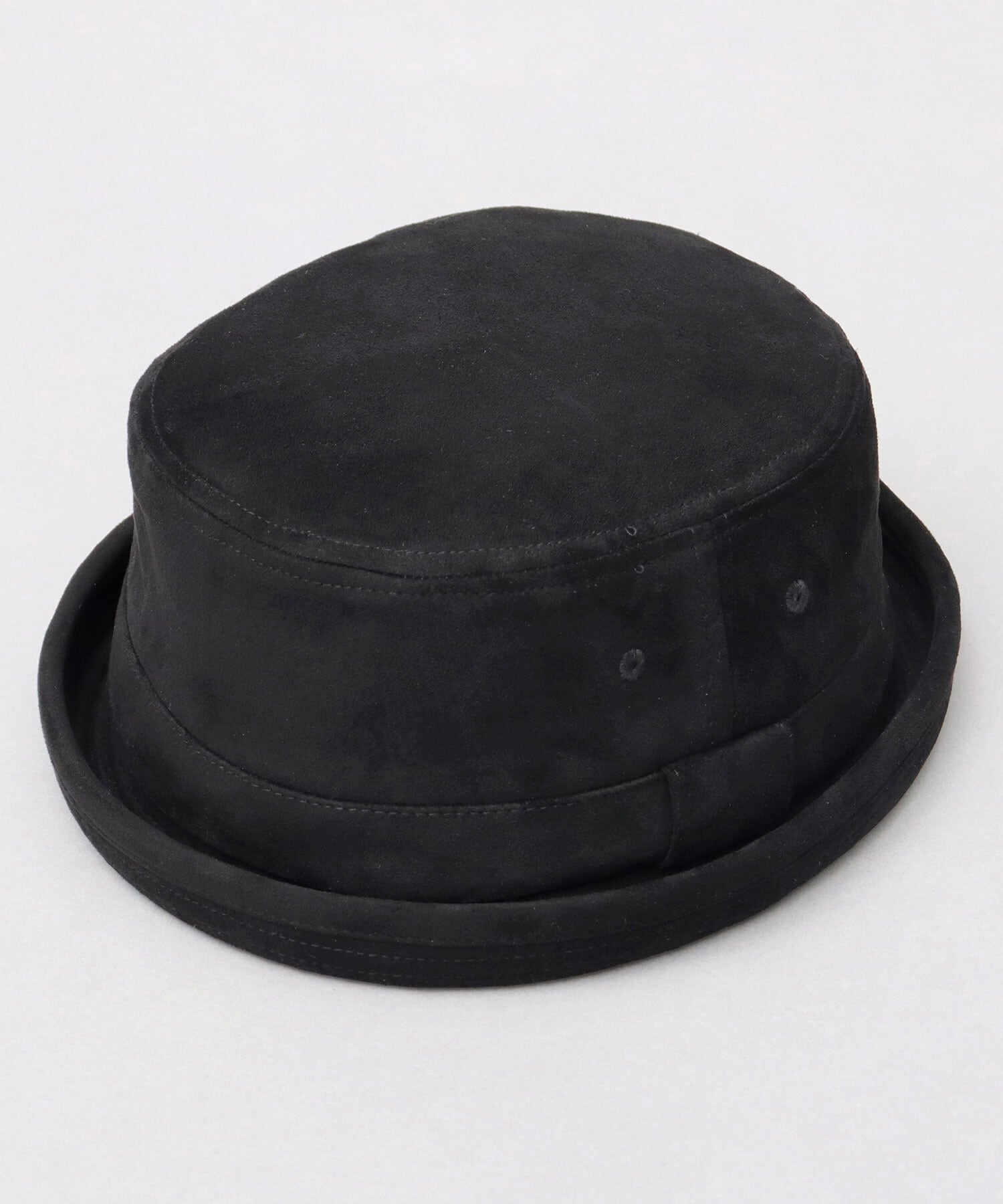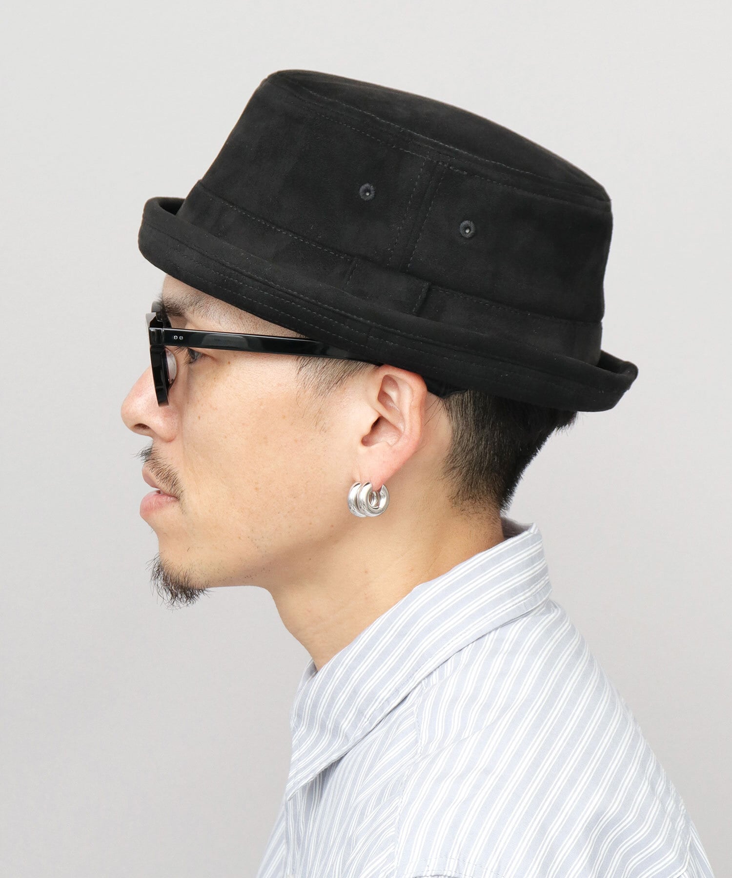 イギリスの料理「ポークパイ」に見た目が似ていることからつけられた名前のポークパイハット。円筒形でトップが平らなクラウンに、お皿の口縁のように上向きになったブリムを合わせたシルエットが特徴。滑らかな起毛感のスエード調(ピーチスキン)素材を使用しているので、しっとりと落ち着いた大人の雰囲気を演出してくれます。中折れハットに比べカジュアルに合わせやすいので、クラシカルなキレイめスタイルから、カジュアル全般まで、幅広いスタイルにマッチしてくれます。シンプルなスタイリングにも、サッと被るだけで、大人なこなれ感を演出してくれる便利アイテム。