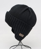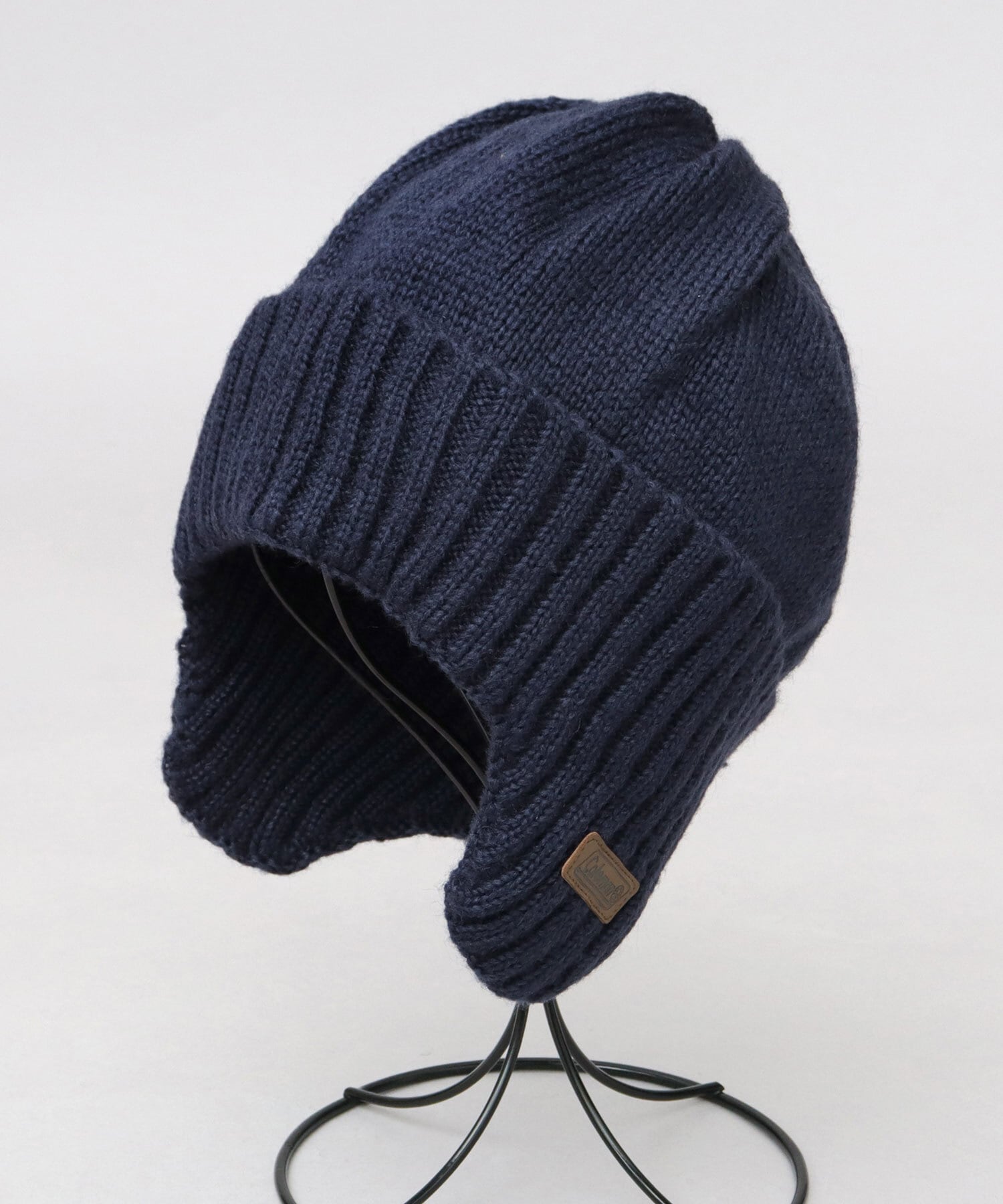 見た目にも暖かな耳当て付きのニットキャップ。レザー調素材のロゴ入りネームタグがワンポイントに。