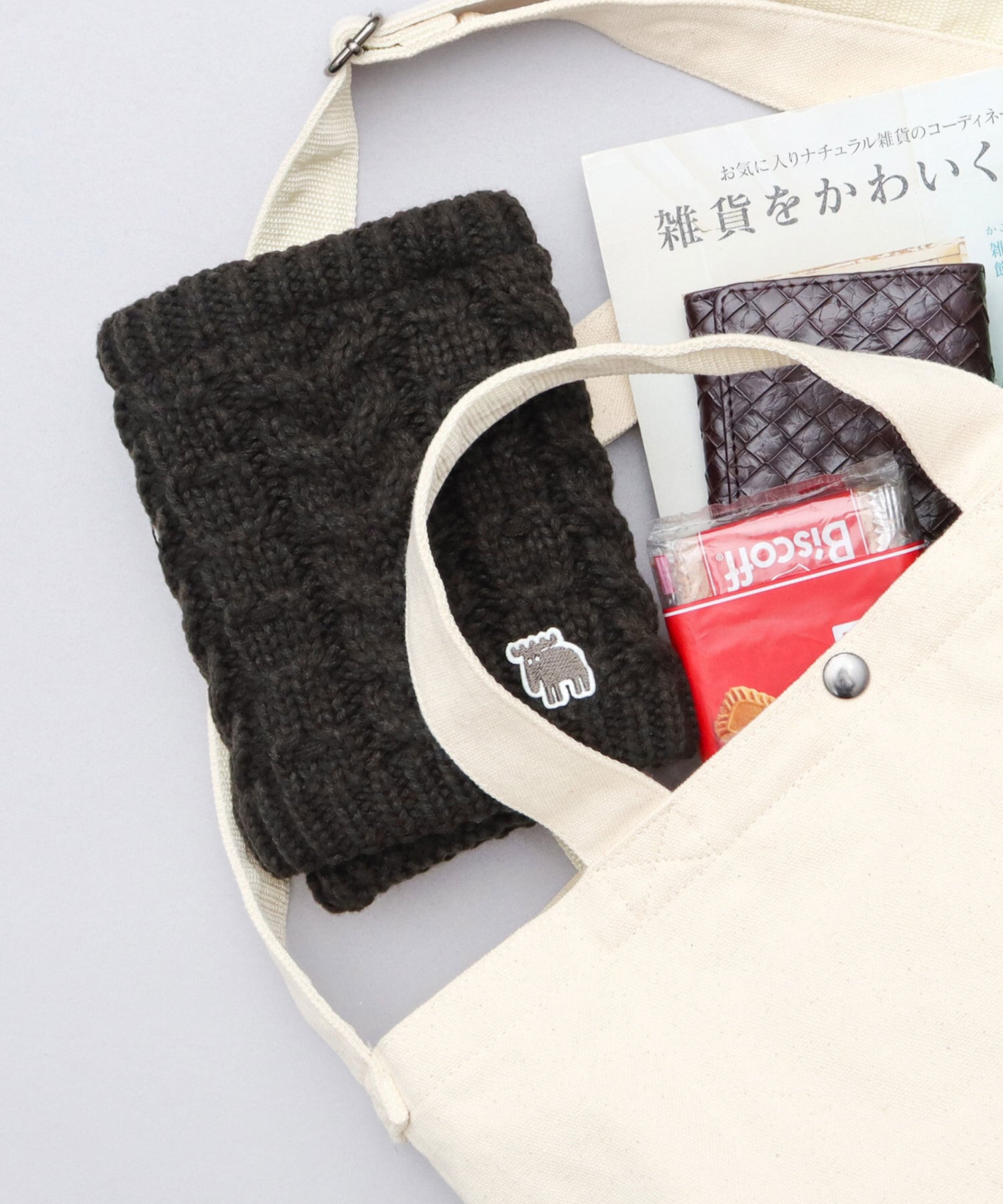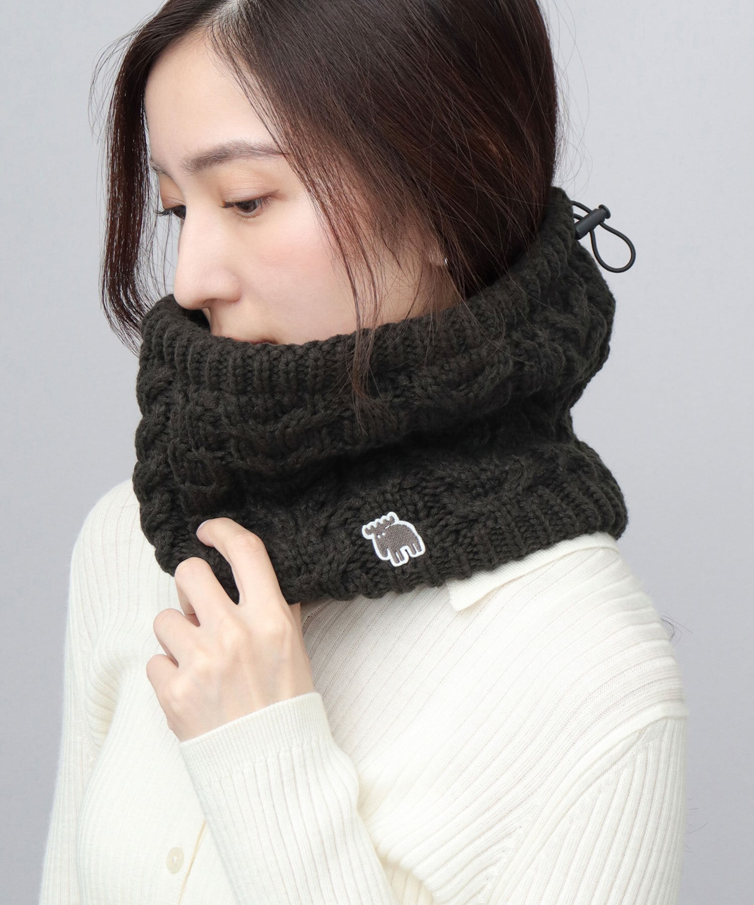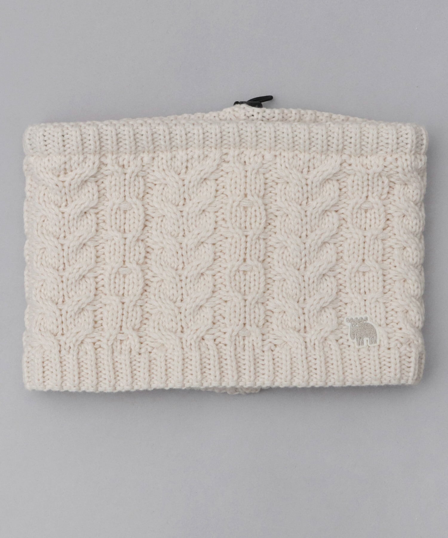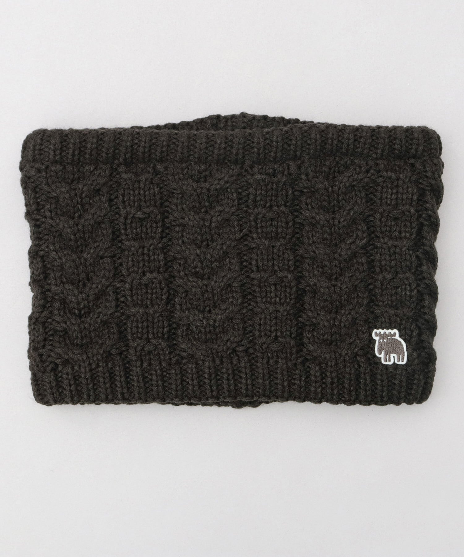 全体にケーブルニット生地を使用した、見た目にも暖かみのある表情のネックウォーマー。エルク(ヘラジカ)の刺繍ワッペンがワンポイントに。