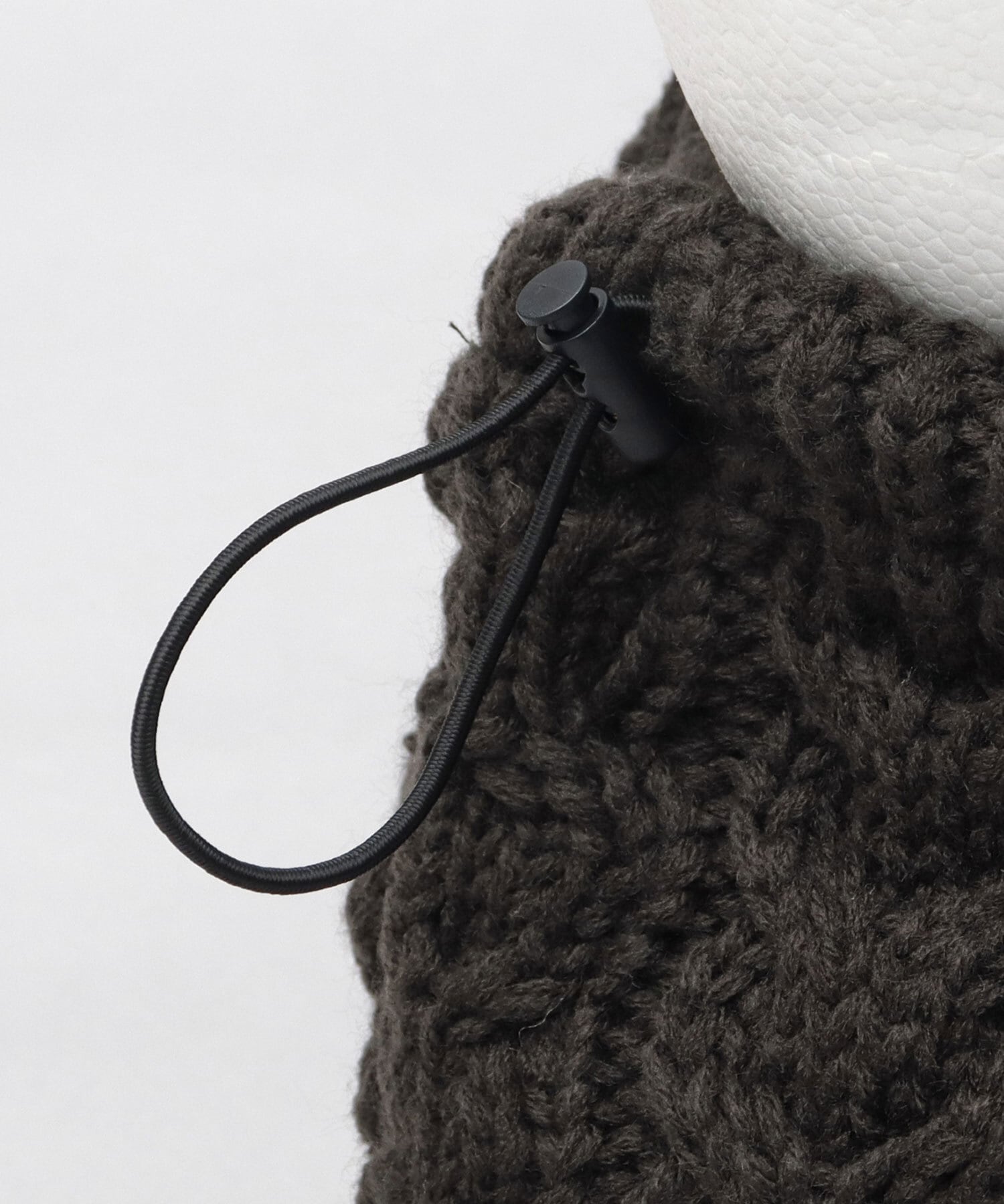 首部分にはゴム製のドローコードがあり、ストッパーで絞ることでフィット感の調節が可能。絞れば隙間風の侵入を防ぎ、しっかり防寒。