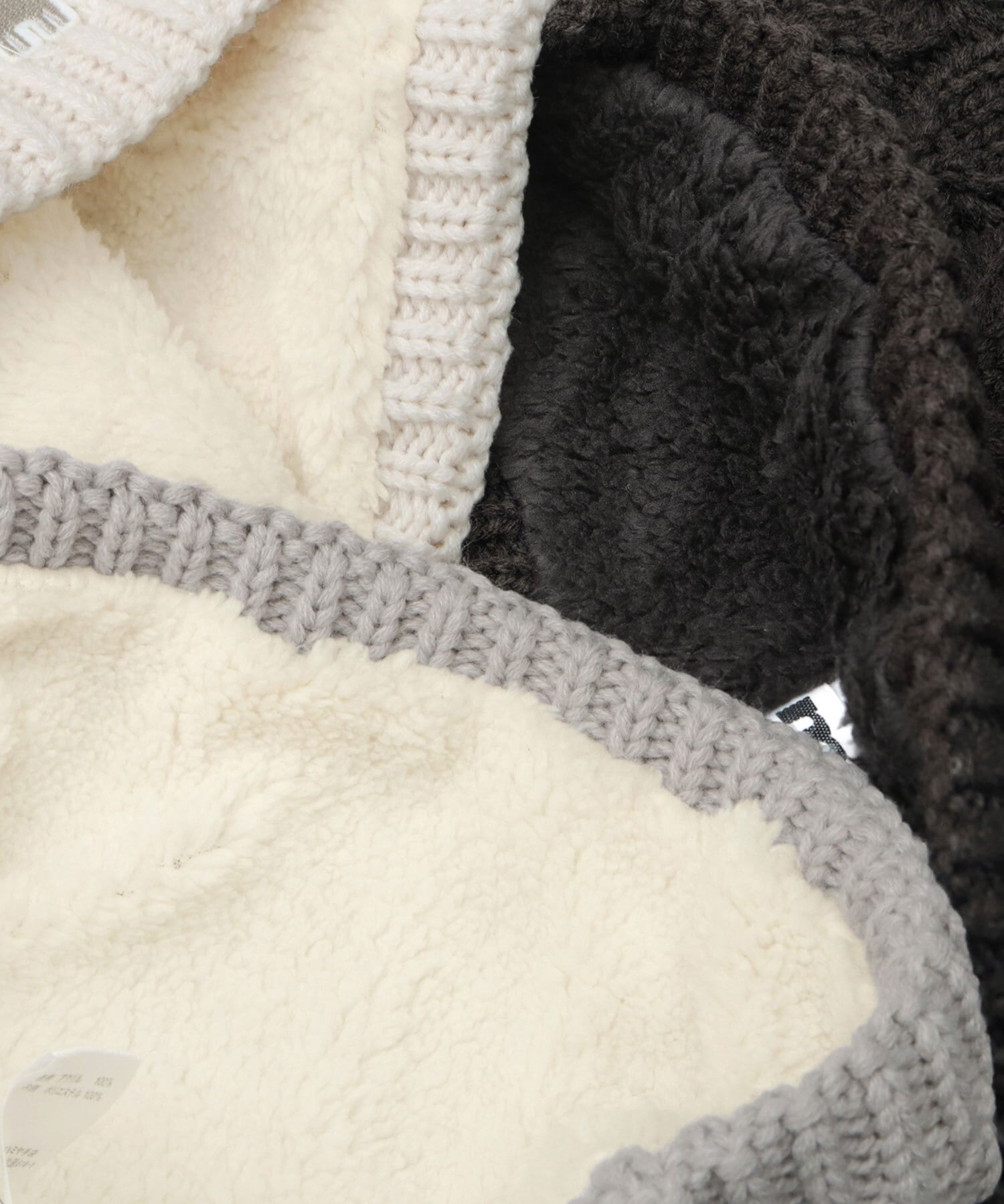肌に当たる裏地部分には、ふんわり柔らかく、とろみのある質感のボア素材を使用。見た目だけでなく、保温性・防寒性もしっかり完備した作り。