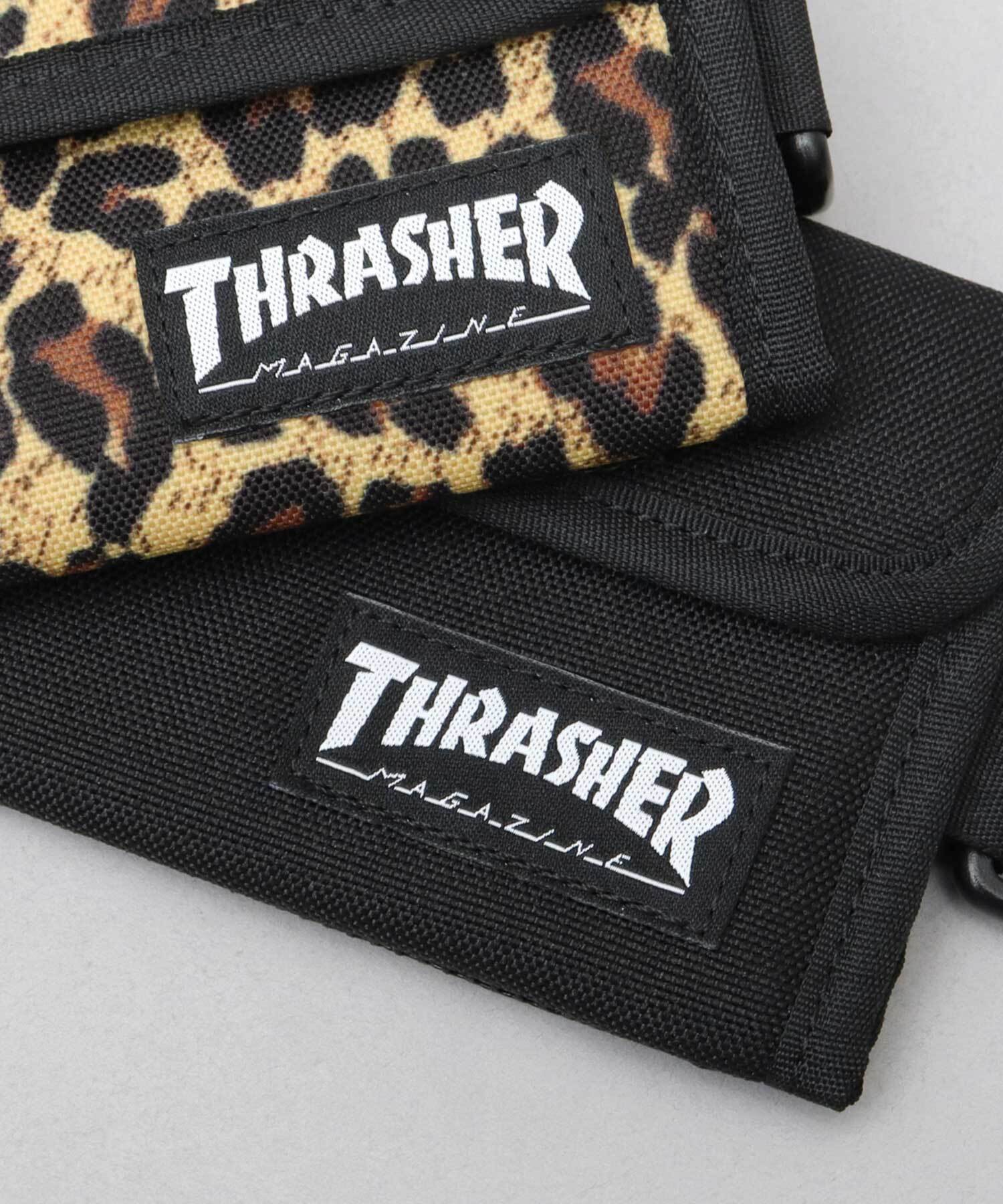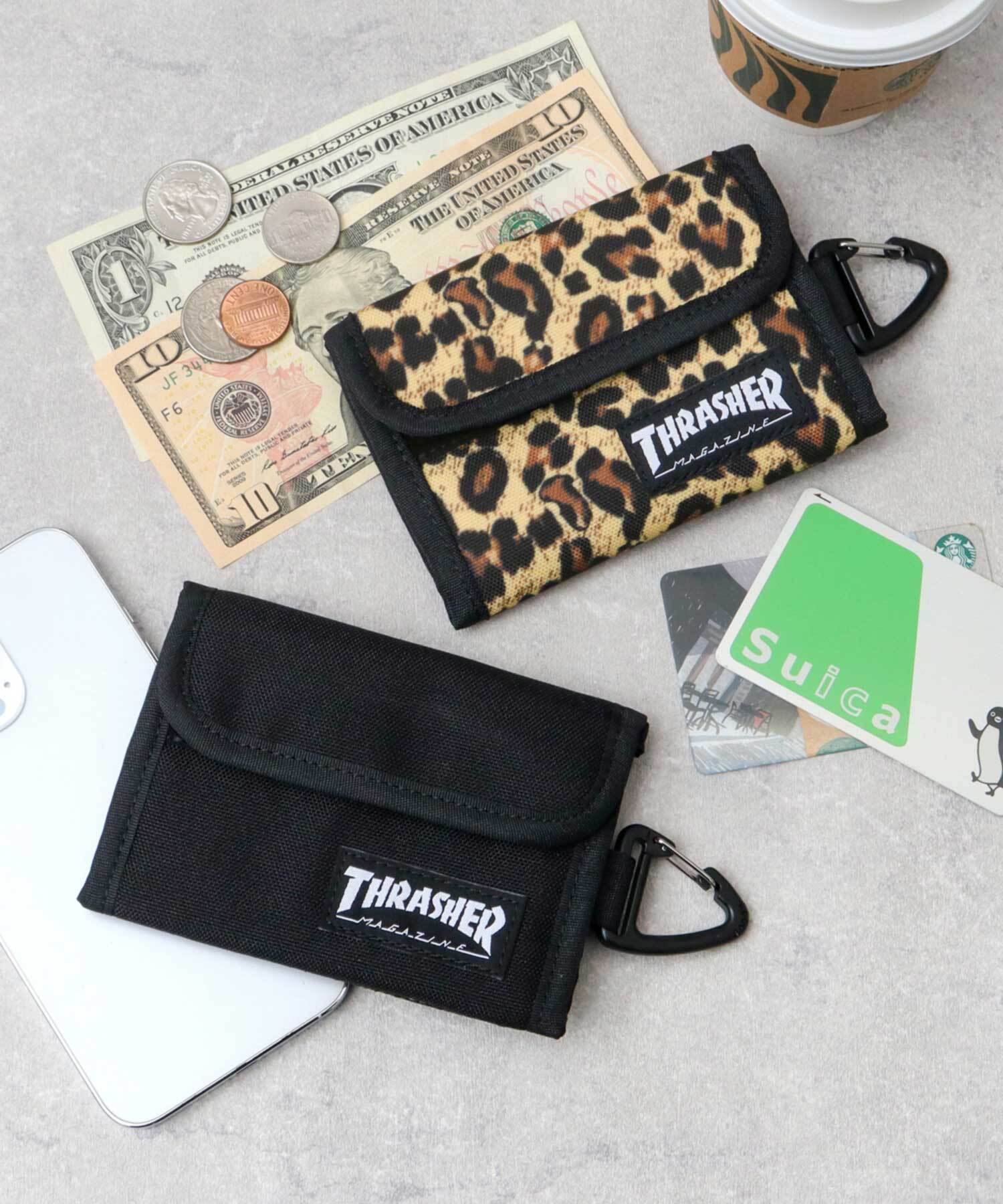 世界中のスケーターから人気のあるブランド“THRASHER(スラッシャー)”のビルフォードウォレット。シーンを問わず使いやすいシンプルなブラックと、ファッション界で長年愛されている定番デザインのレオパード柄の2デザイン。二つ折り財布ならではのコンパクトな見た目ながら、内部にはお札や領収書、小銭を入れるスペースはもちろん、4箇所のカードポケットも完備。サイド部分に、ベルトループやバッグのショルダーへの取り付けの際に便利な三角カラビナを配置。ちょっとしたお買い物やお散歩に手ぶらでお出掛けしたい時はもちろん、スタイリングのアクセントにも使えるアイテムです。