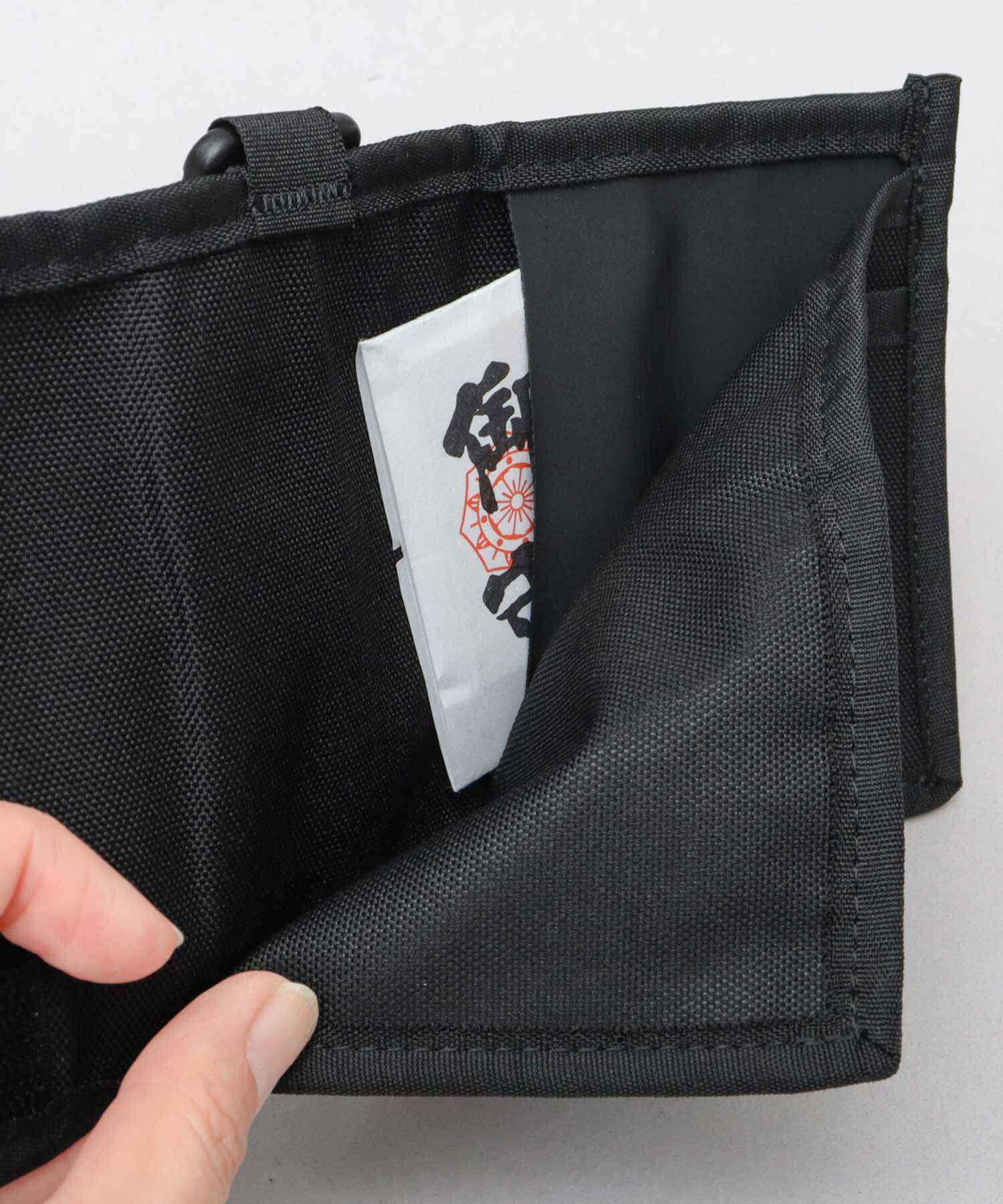 収納スペースは、マジックテープでざっくりと開く仕様。内部には、お札を入れられるロングポケット×1、レシートやお守りなども入れられるフリーポケット×1、カードポケット×4を完備。