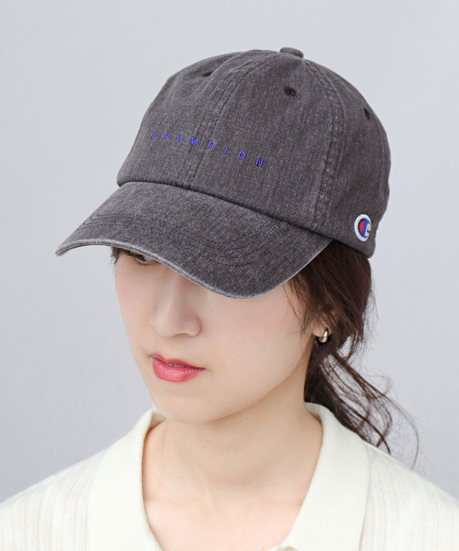 フロントに施された、小ぶりな“CHAMPION”刺繍がワンポイントに。サイドのロゴワッペンがアクセントに。