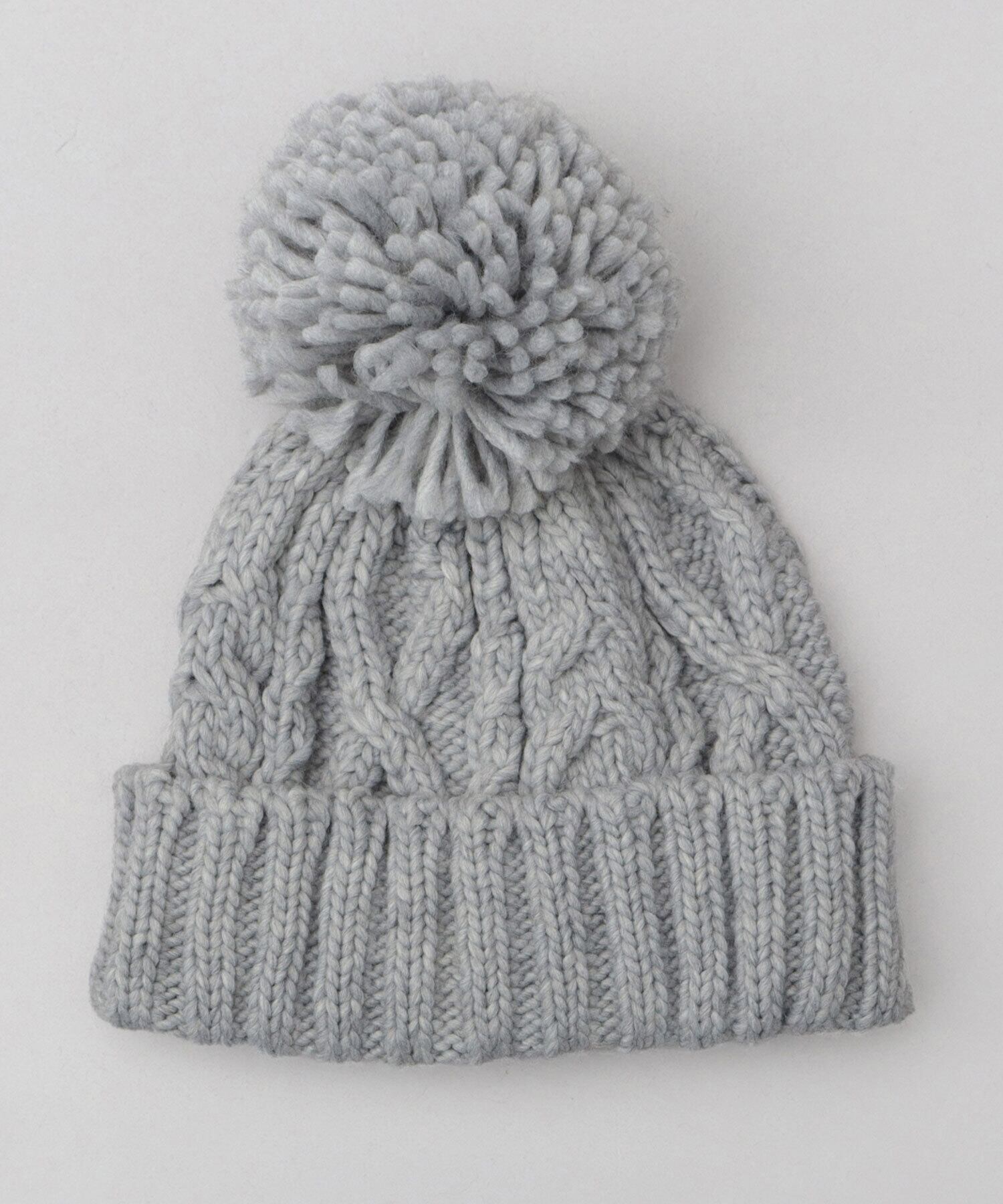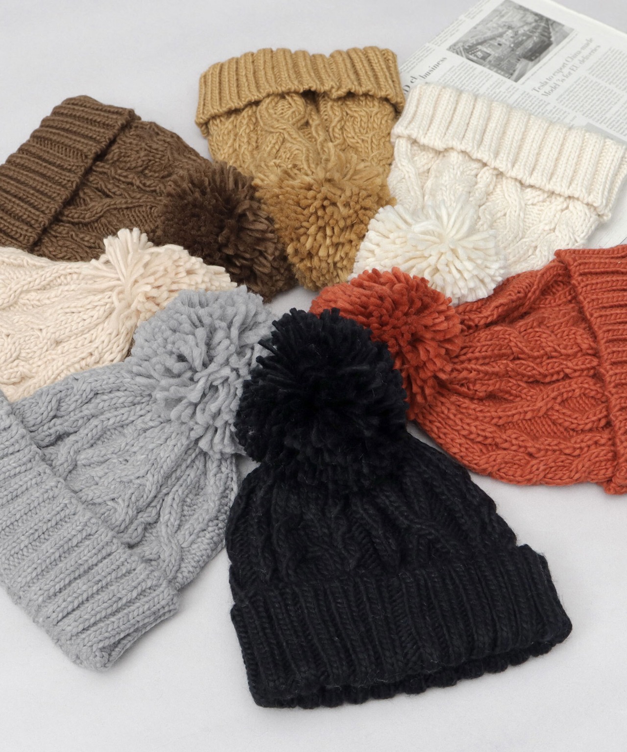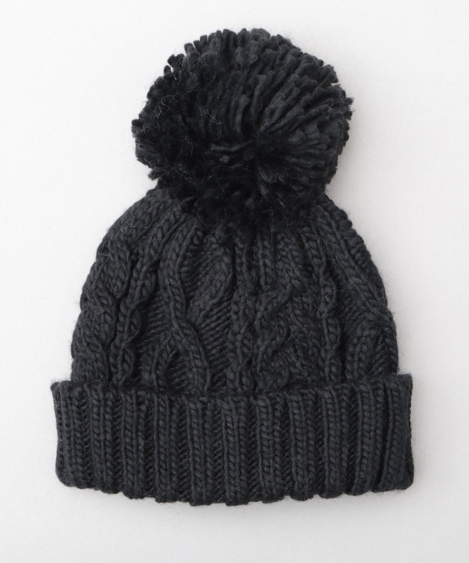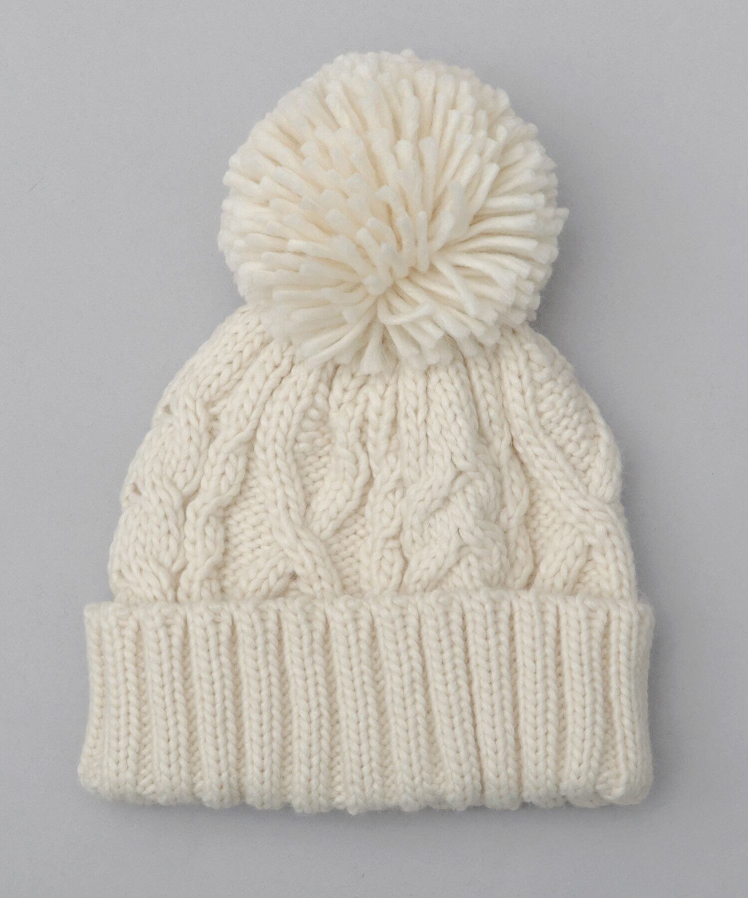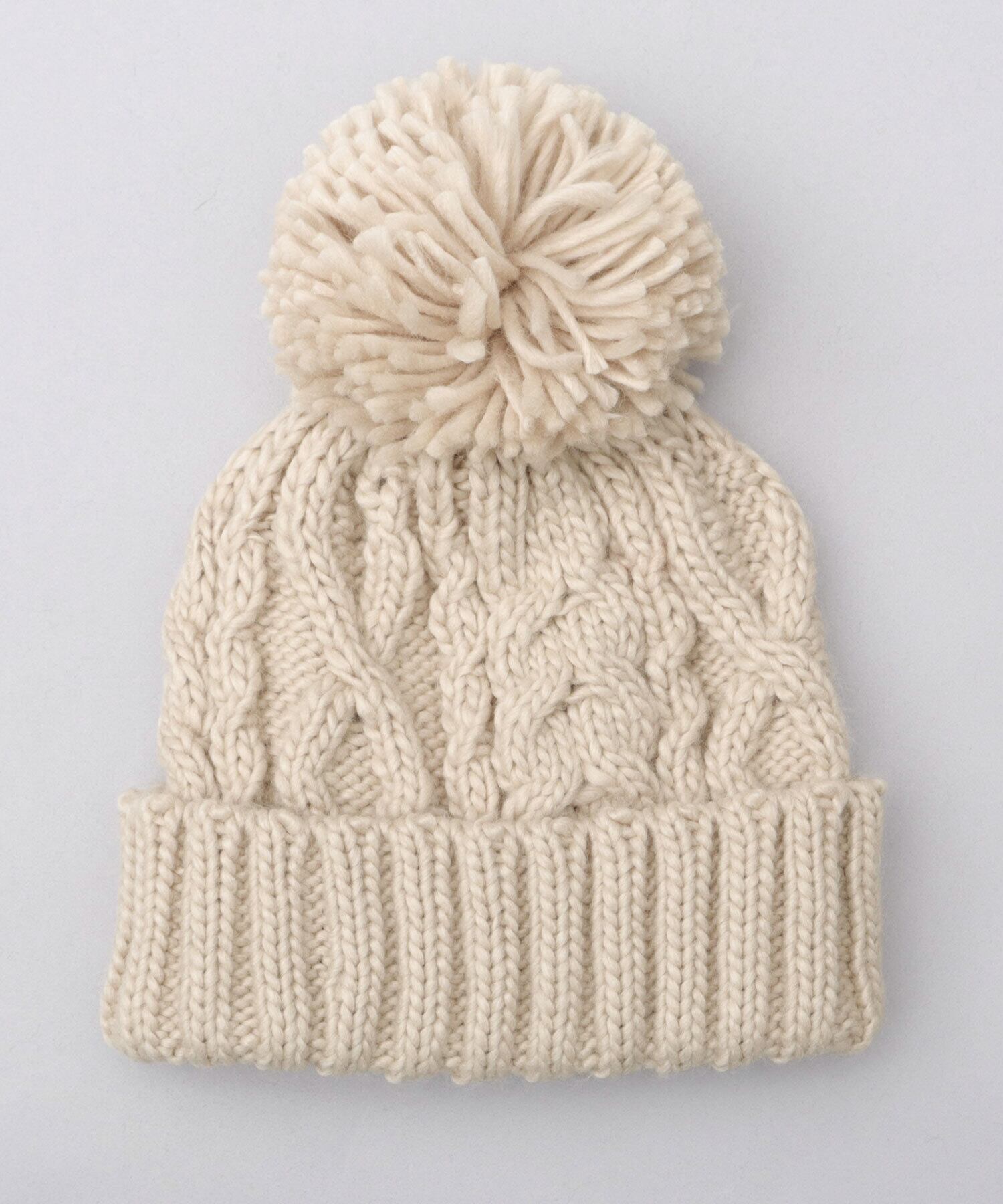大きめのポンポンが付いた、ざっくり編みのケーブルニット帽。幅広いスタイリングに馴染みやすいシンプルデザイン。