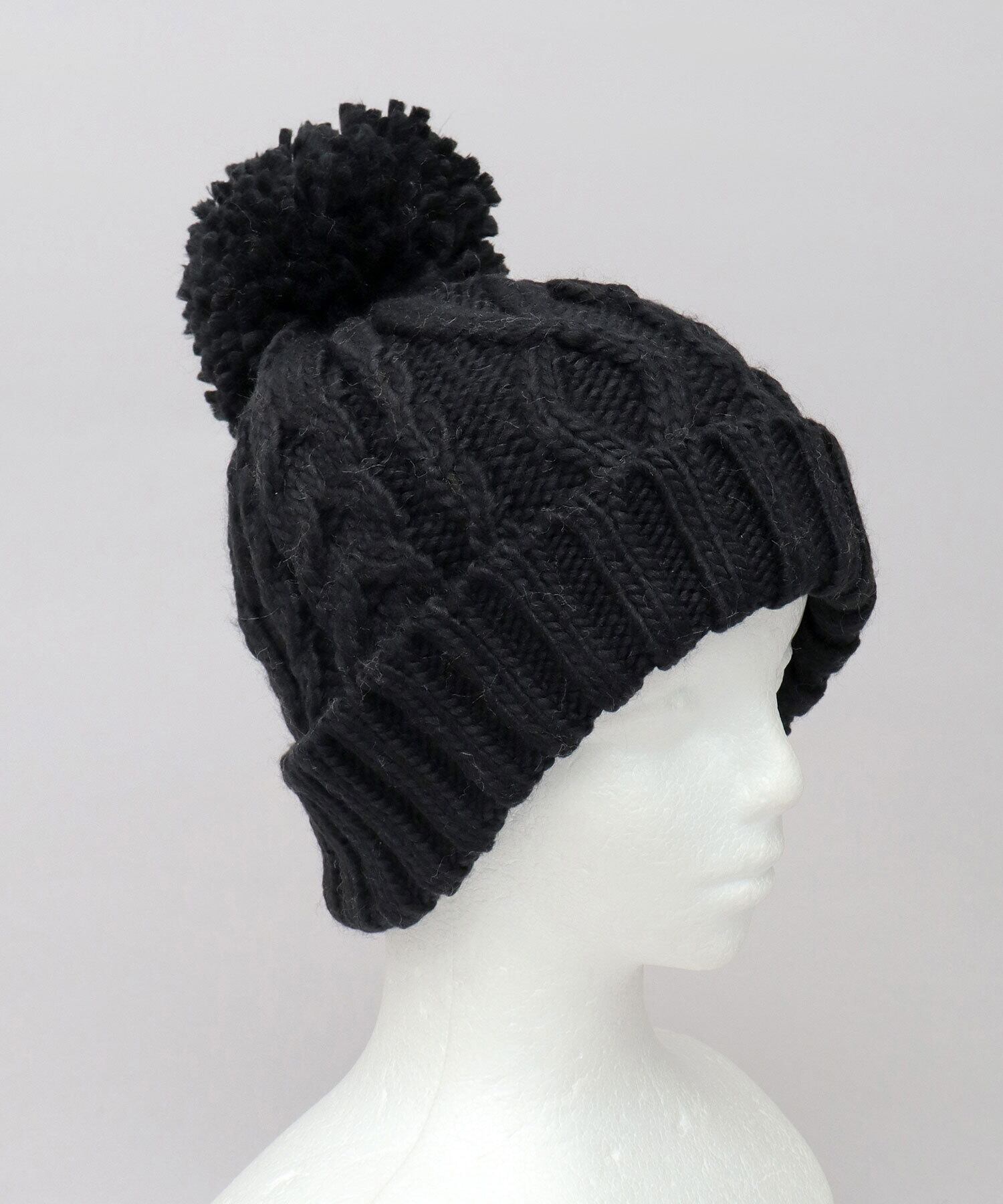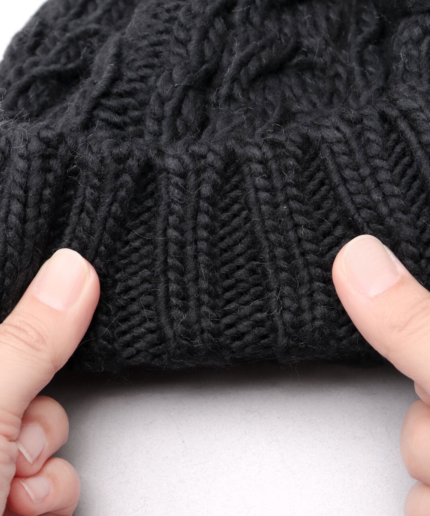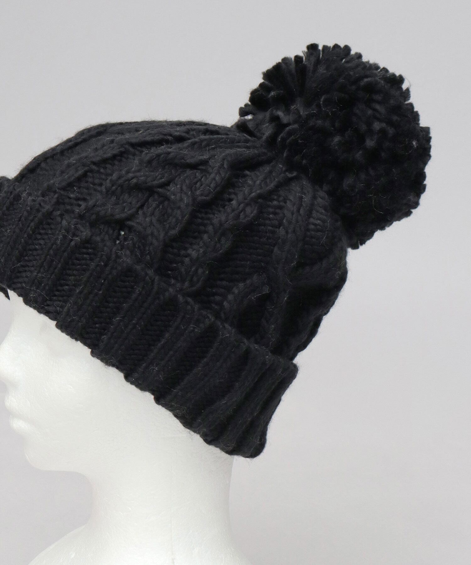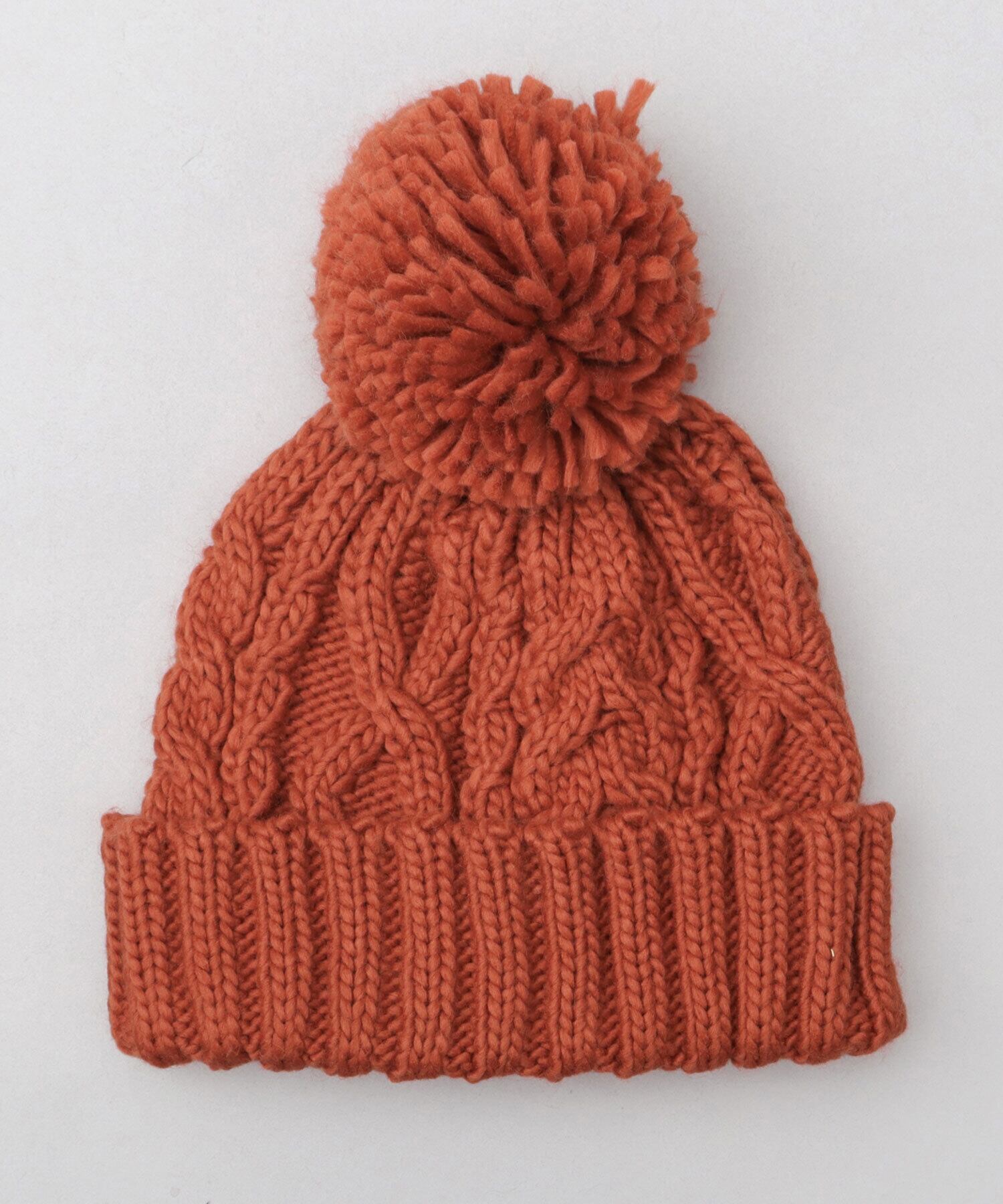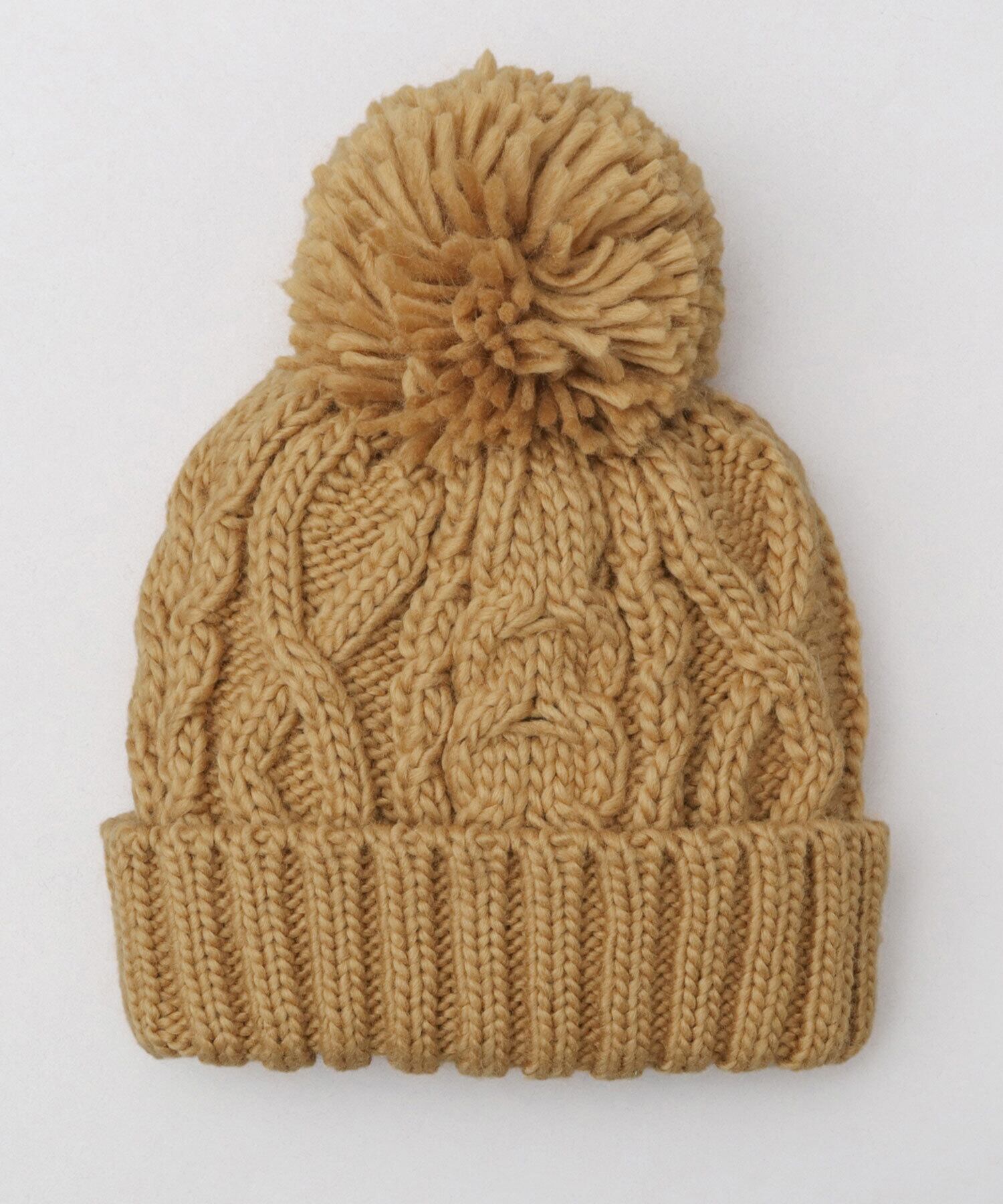 大きめのポンポンが付いた、ざっくり編みのケーブルニット帽。幅広いスタイリングに馴染みやすいシンプルデザイン。