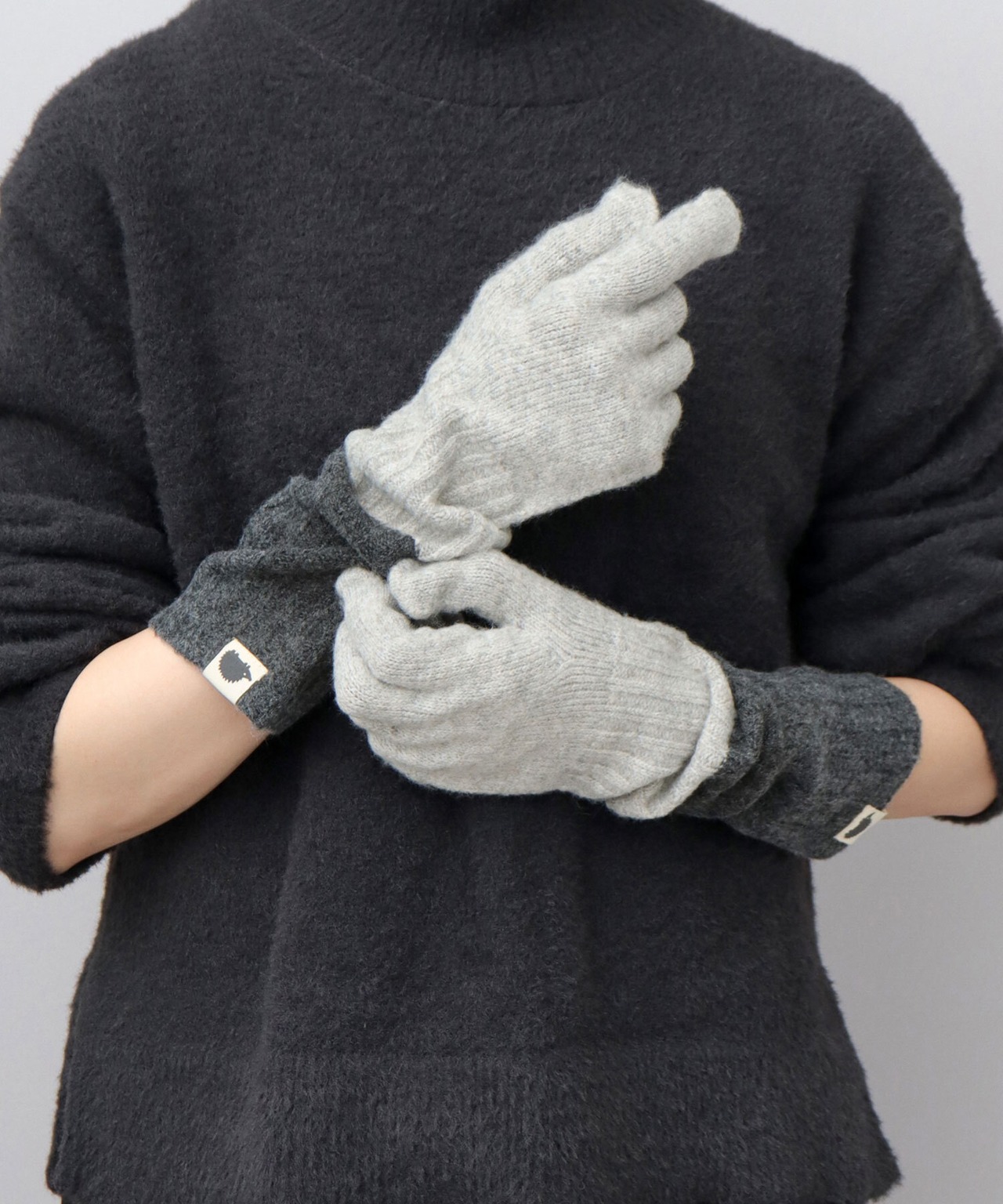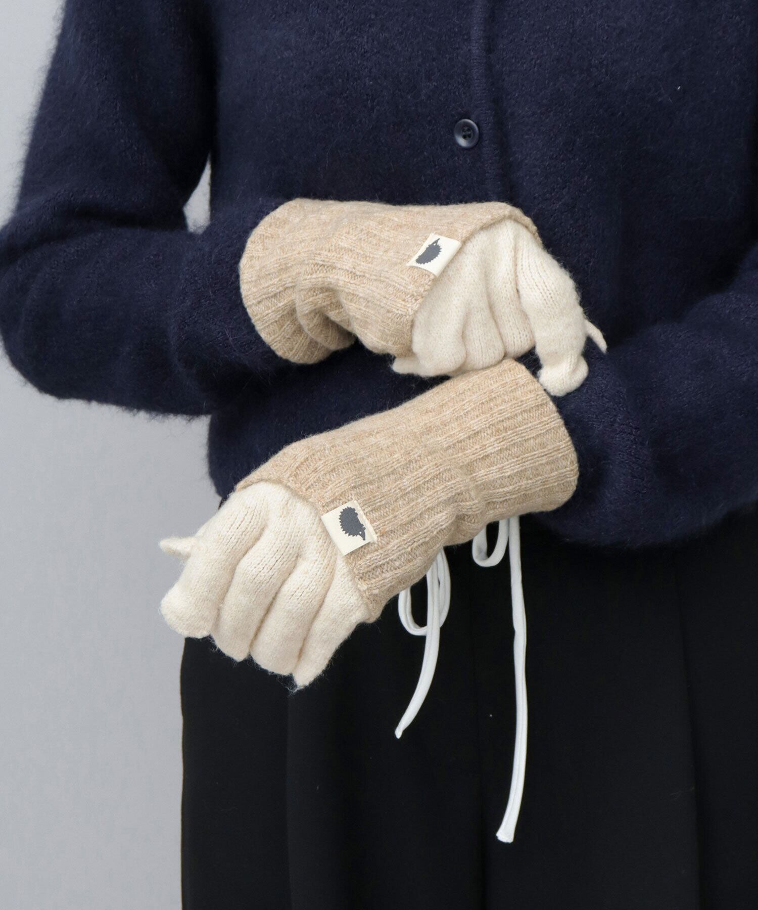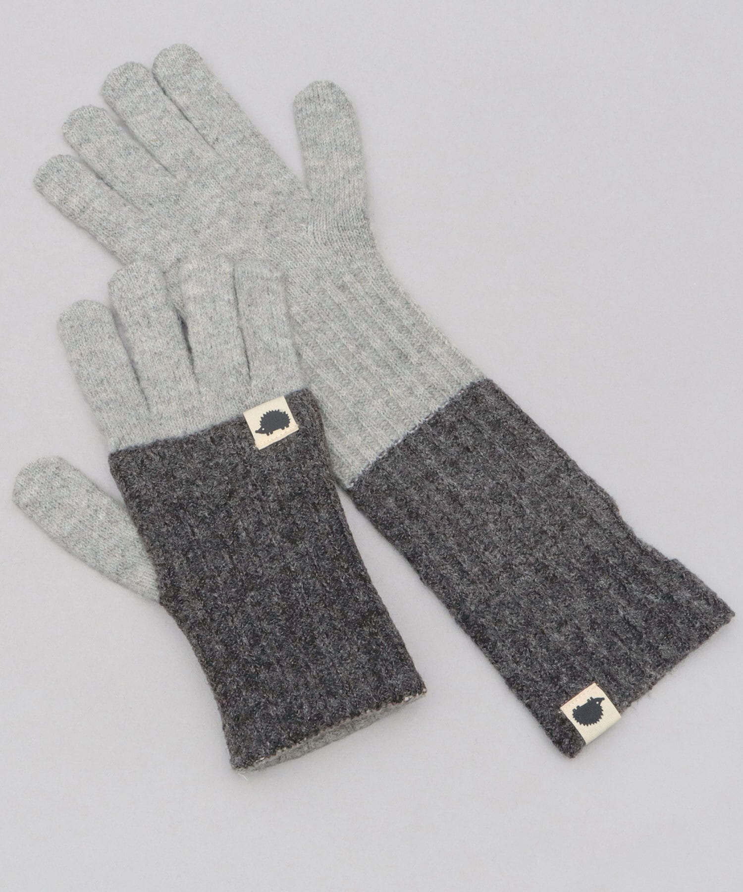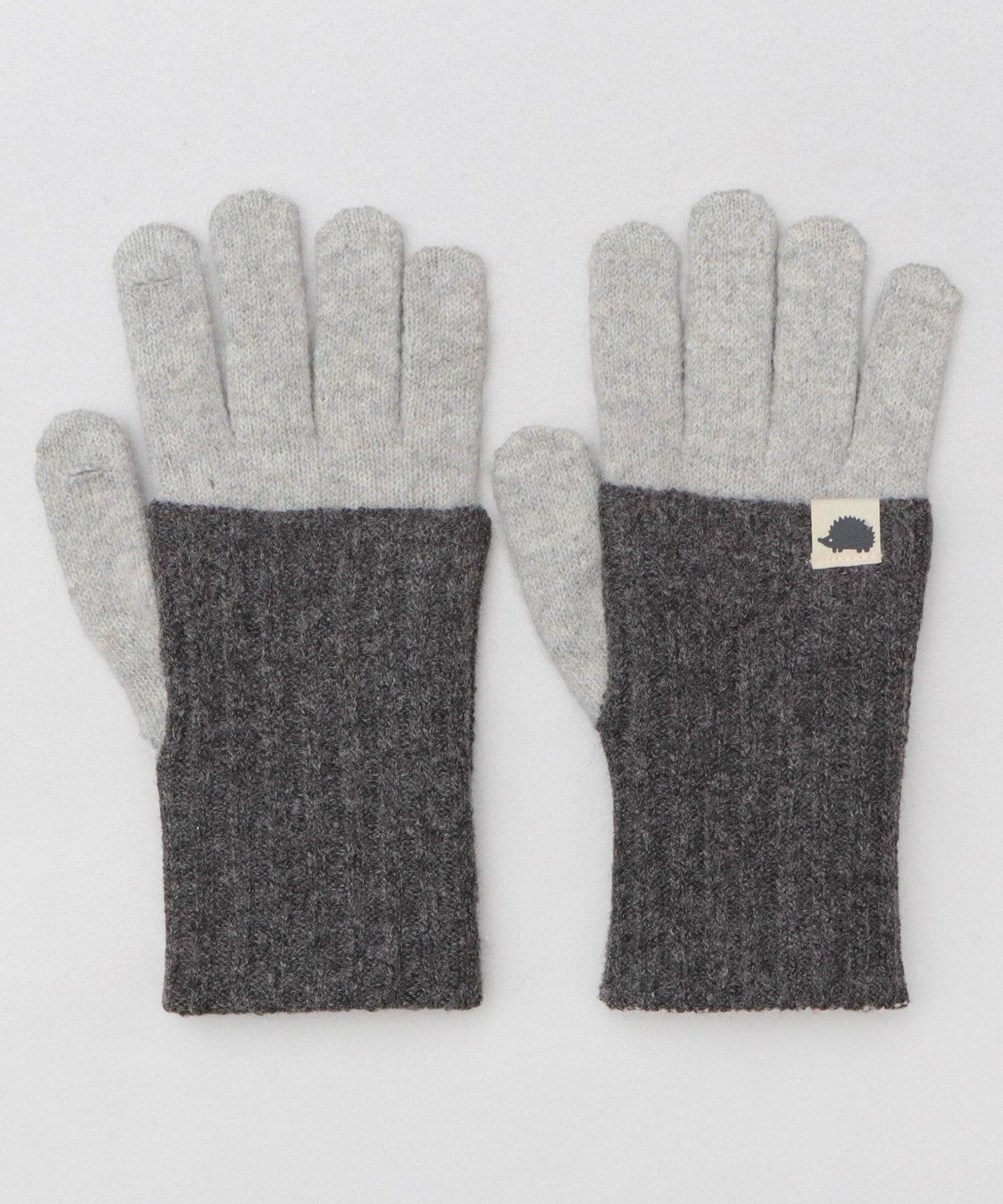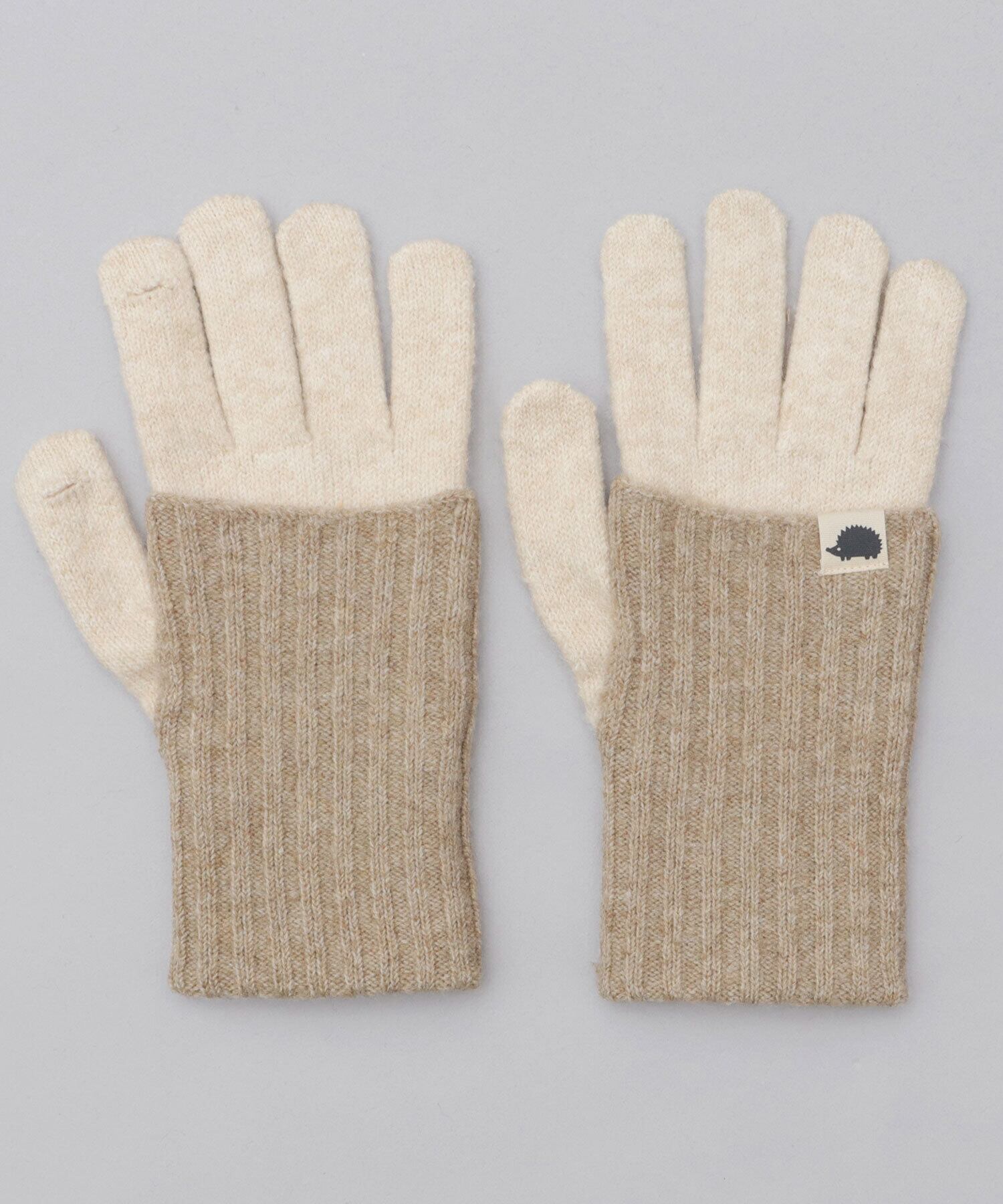 寒い冬の風から指先をしっかり守れる、5本指仕様のニットグローブ。重たくなりがちな冬の装いのアクセントに使いやすい、2トーンデザイン。ハリネズミの小ぶりなブランドタグが、さり気ないワンポイントに。
