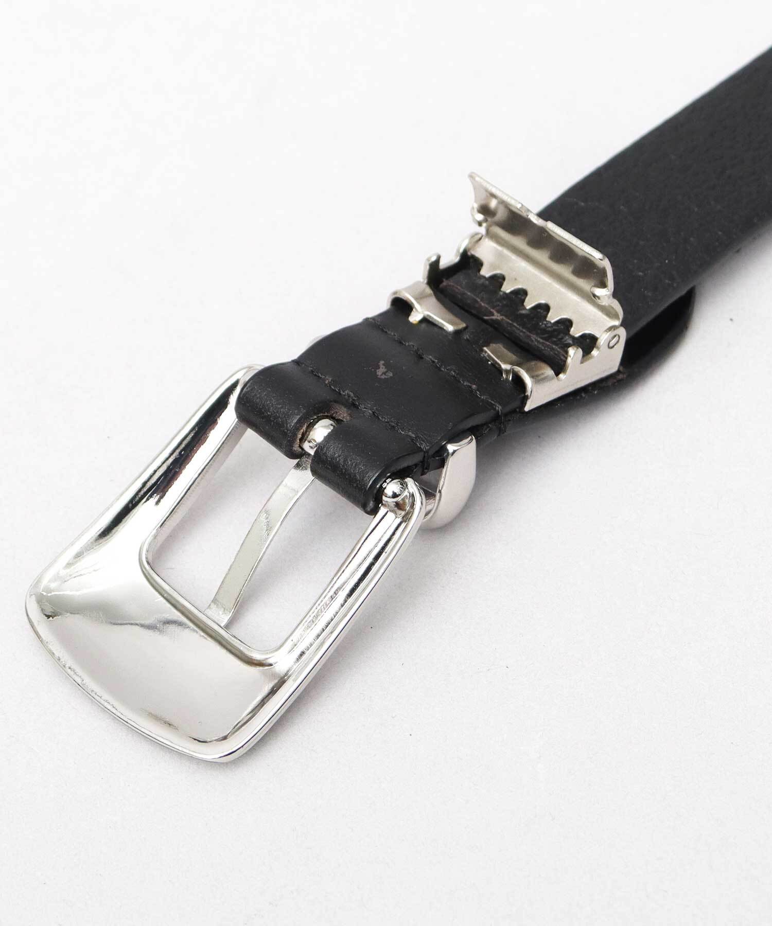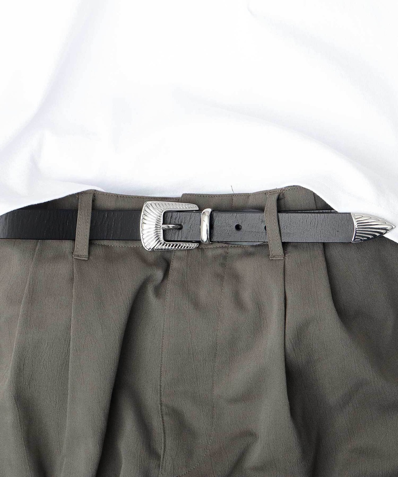 ヴィンテージライクな牛革を使用したデイリーに使いやすい、レザーナローベルト。トレンド感溢れるフラッシュシルバーのパーツがスタイリングのアクセントに。
