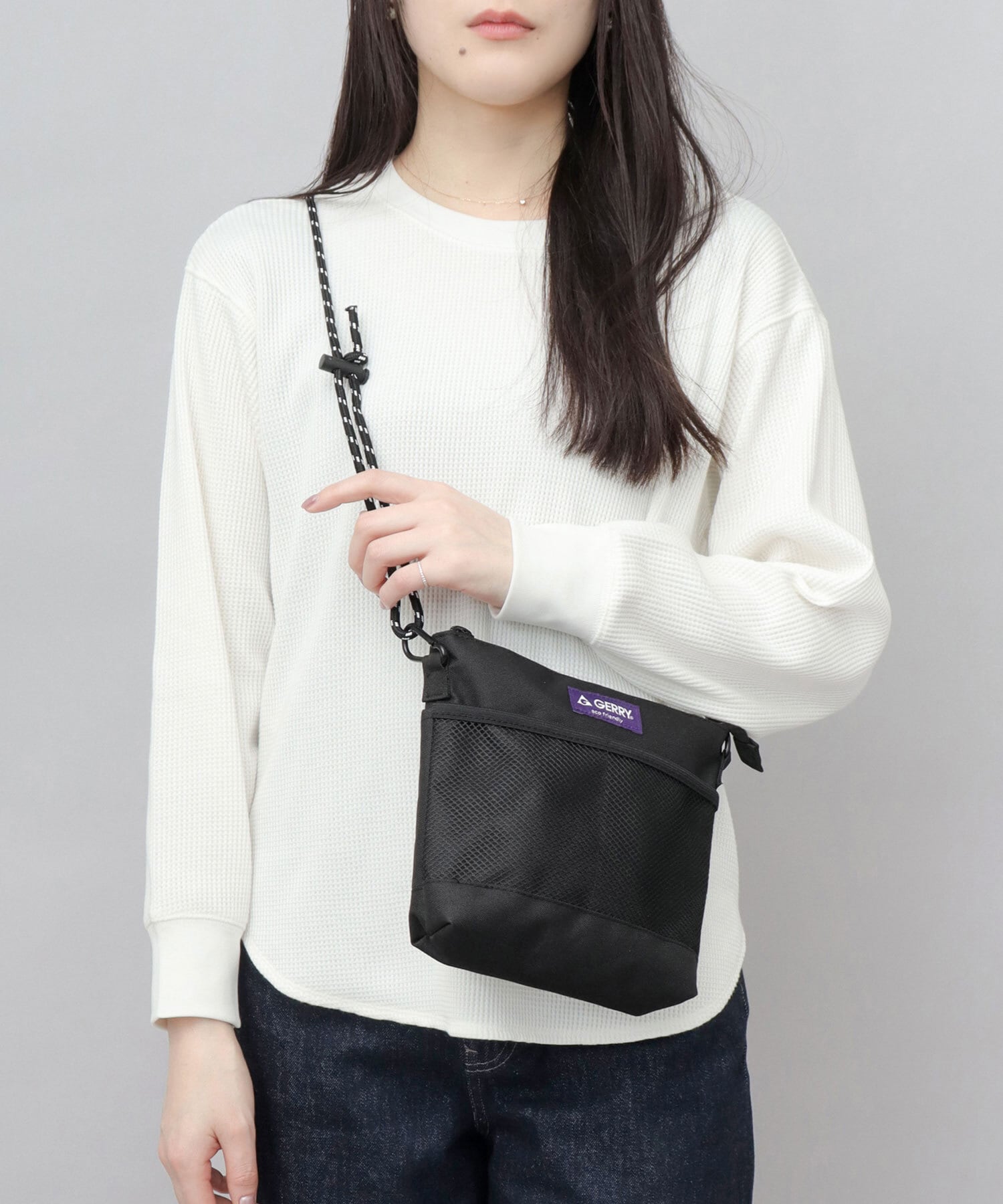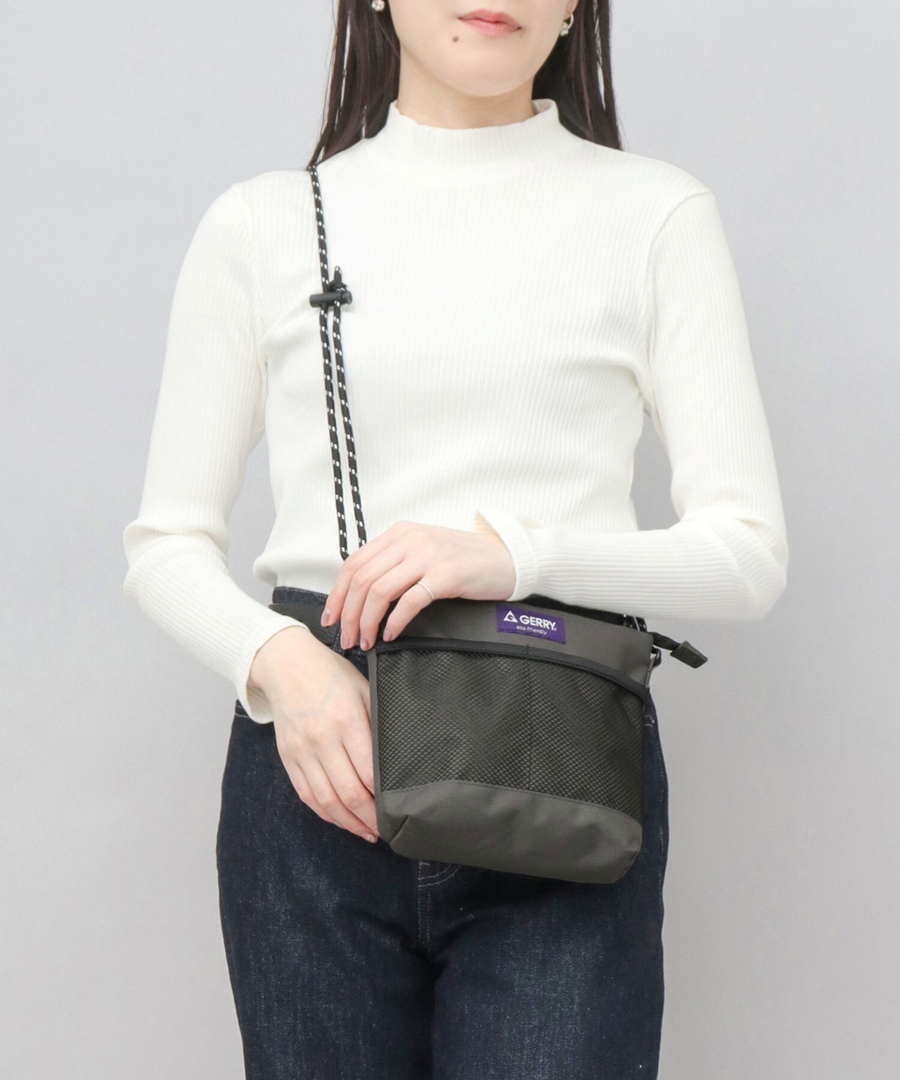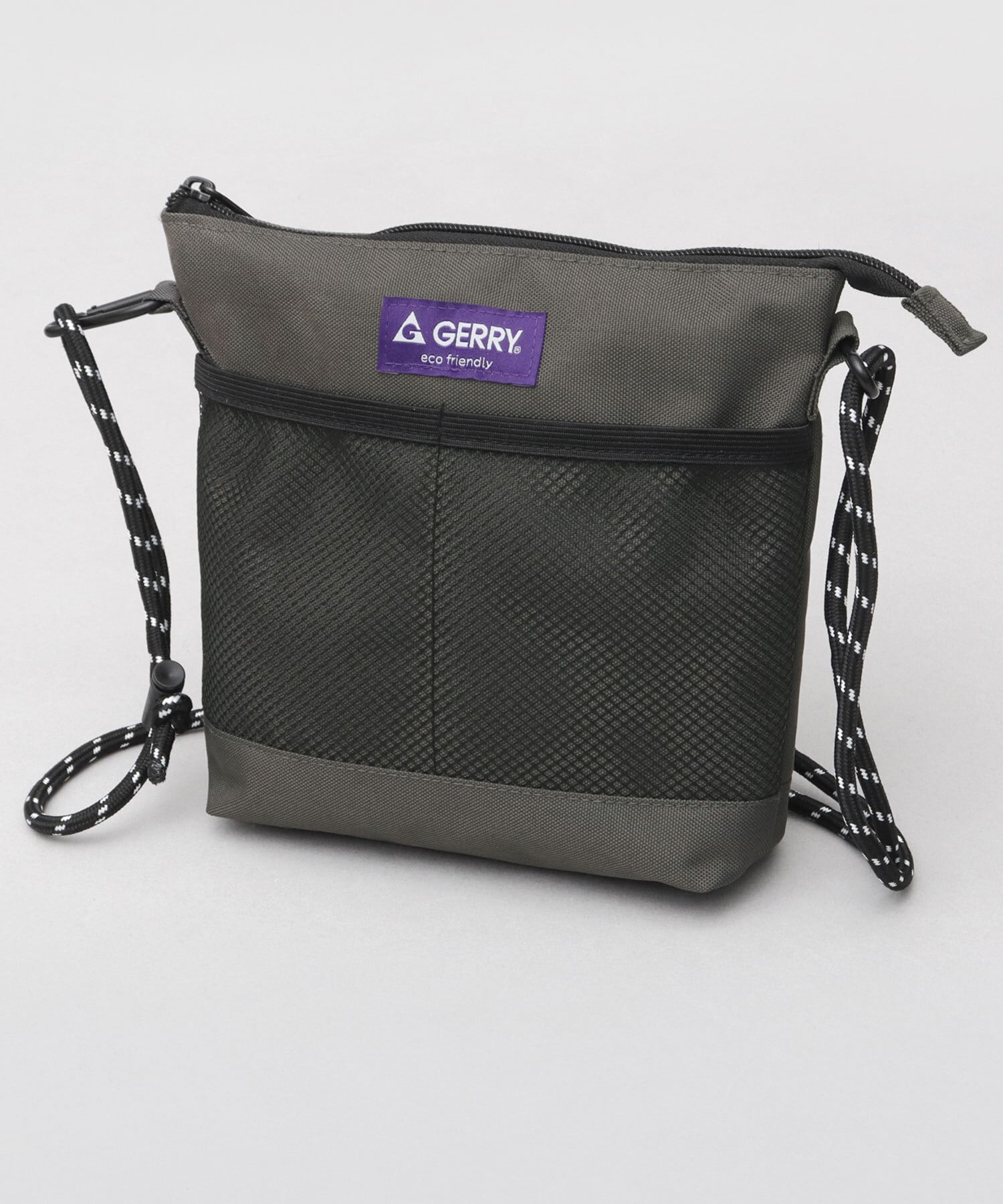 アメリカの老舗アウトドアブランド“GERRY(ジェリー)”のメッシュポケットサコッシュ。ミニウォレットやスマホ、パスケースなど、日常使う必要最低限の荷物が収納可能な、コンパクトなサイズ感が魅力。バッグ内外に配置されたポケットで、細かいアイテムもしっかり整頓して持ち運びが可能。ショルダーストラップは取り外しも出来るので、ポーチとしての使用も可能です。素材にリサイクルポリエステルを使用した、サスティナブルなアイテム。撥水加工を施しているので、急な雨や水濡れにも安心!