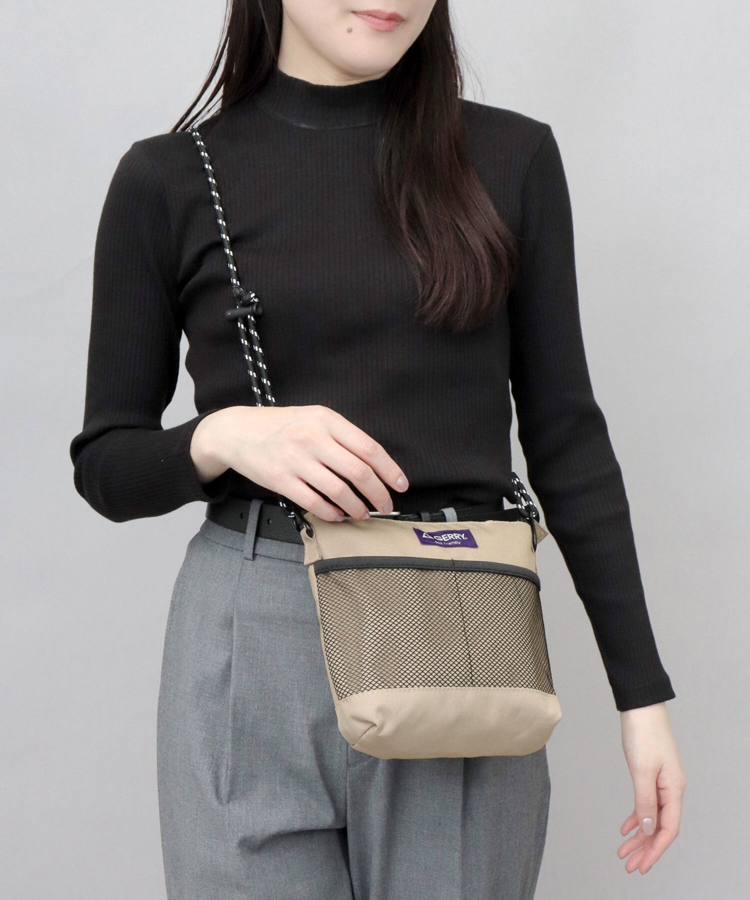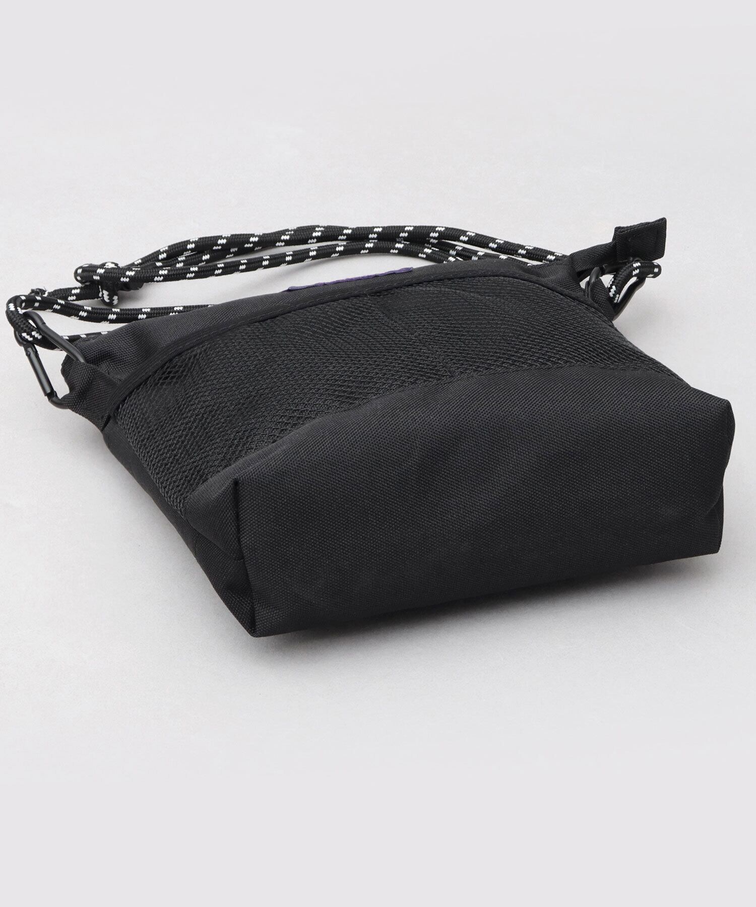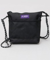 メッシュ素材の外ポケットに、ザイルコードのショルダーベルトやカラビナなど、アウトドアな雰囲気が特徴のミニショルダーバッグ。タウンユースでもアウトドアでも使いやすい、デザイン性と機能性を兼ね備えたアイテム。