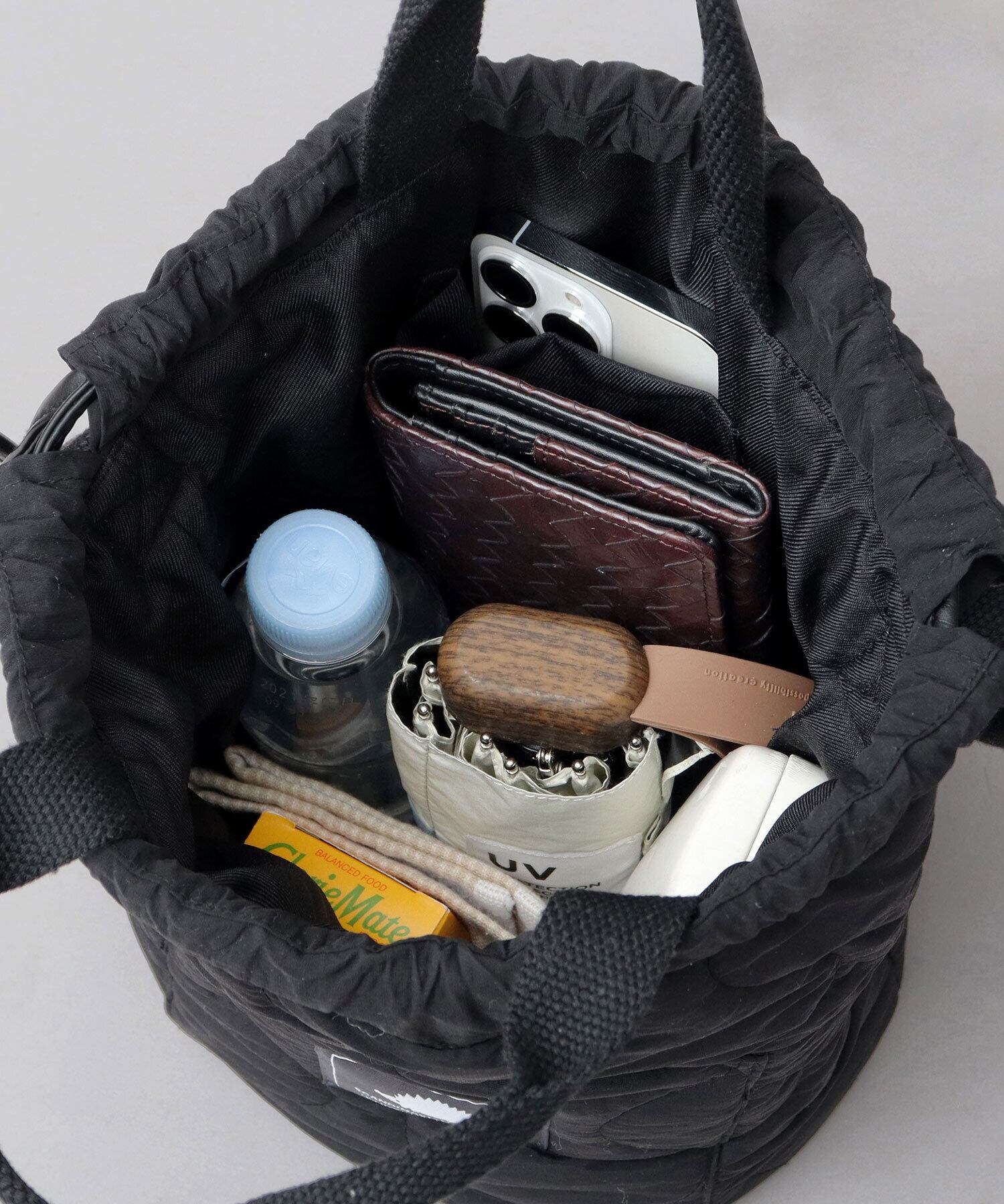 素材には、表生地に撥水加工を施した、軽量ナイロンのひょうたんキルト生地を使用。マットでしわ感のある生地に、ふんわり程よく中綿の詰まった、ふっくらとした立体感のある表情が魅力。雨の日でも気軽に使えて、お手入れも楽ちん。