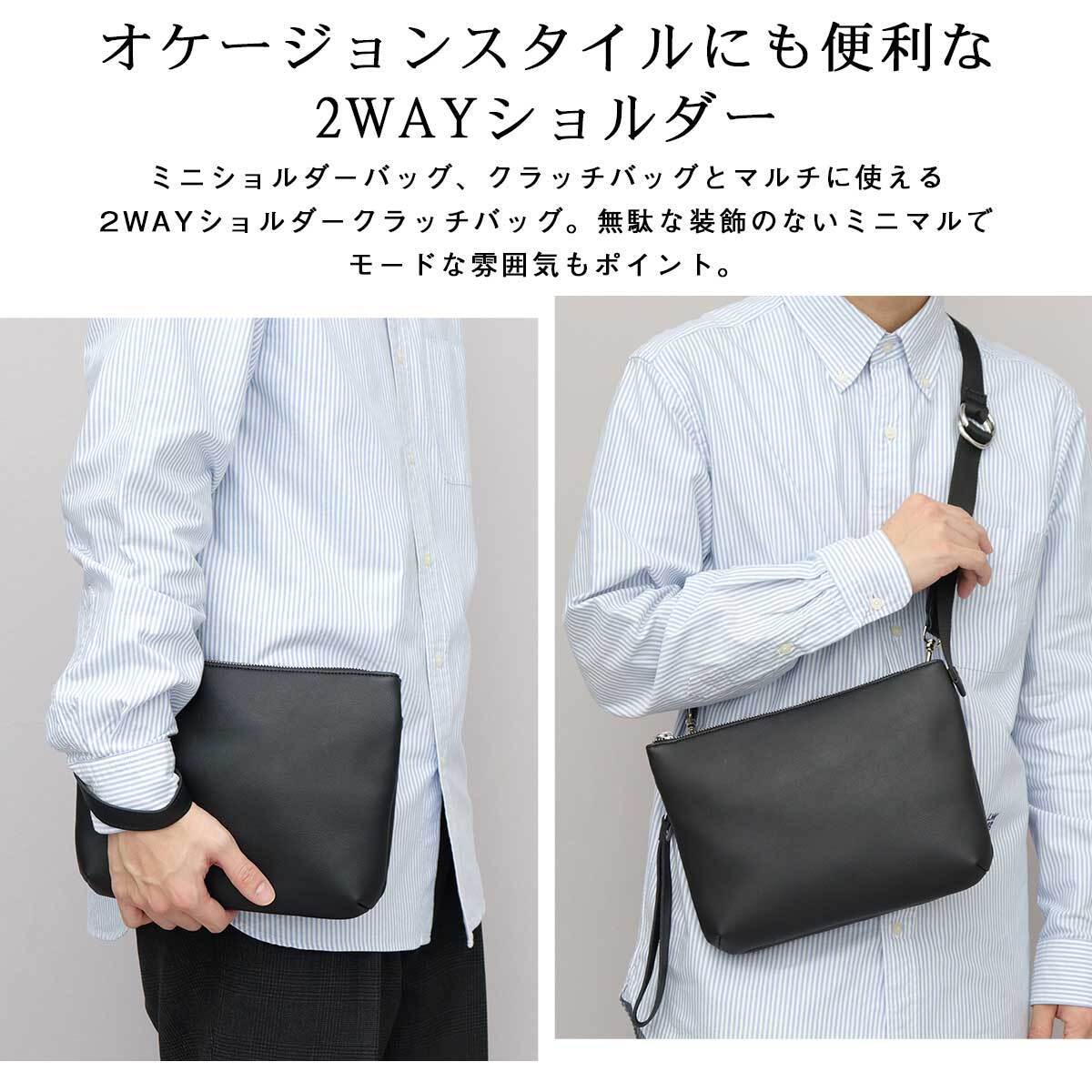 ミニショルダーバッグ、クラッチバッグとマルチに使える2WAYショルダークラッチバッグ。無駄な装飾のない、ミニマルでモードな雰囲気もポイント。
