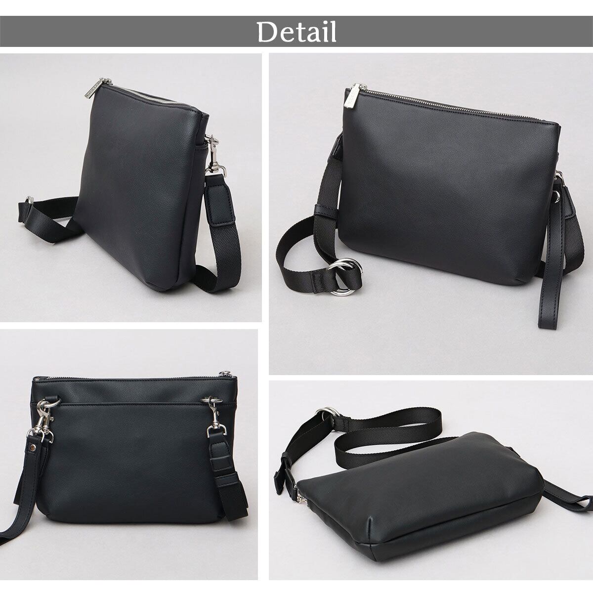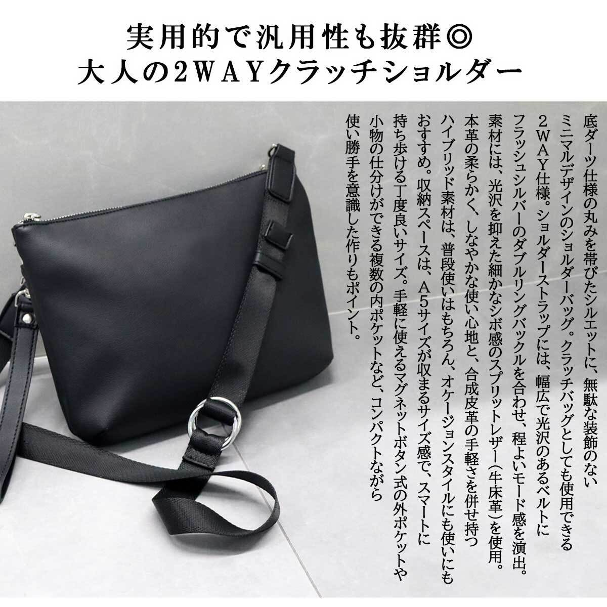 底ダーツ仕様の丸みを帯びたシルエットに、無駄な装飾のないミニマルデザインのショルダーバッグ。クラッチバッグとしても使用できる2WAY仕様。ショルダーストラップには、幅広で光沢のあるベルトにフラッシュシルバーのダブルリングバックルを合わせ、程よいモード感を演出。素材には、光沢を抑えた細かなシボ感のスプリットレザー(牛床革)を使用。本革の柔らかく、しなやかな使い心地と、合成皮革の手軽さを併せ持つハイブリッド素材は、普段使いはもちろん、オケージョンスタイルにも使いにもおすすめ。収納スペースは、A5サイズが収まるサイズ感で、スマートに持ち歩ける丁度良いサイズ。手軽に使えるマグネットボタン式の外ポケットや、小物の仕分けができる複数の内ポケットなど、コンパクトながら、使い勝手を意識した作りもポイント。