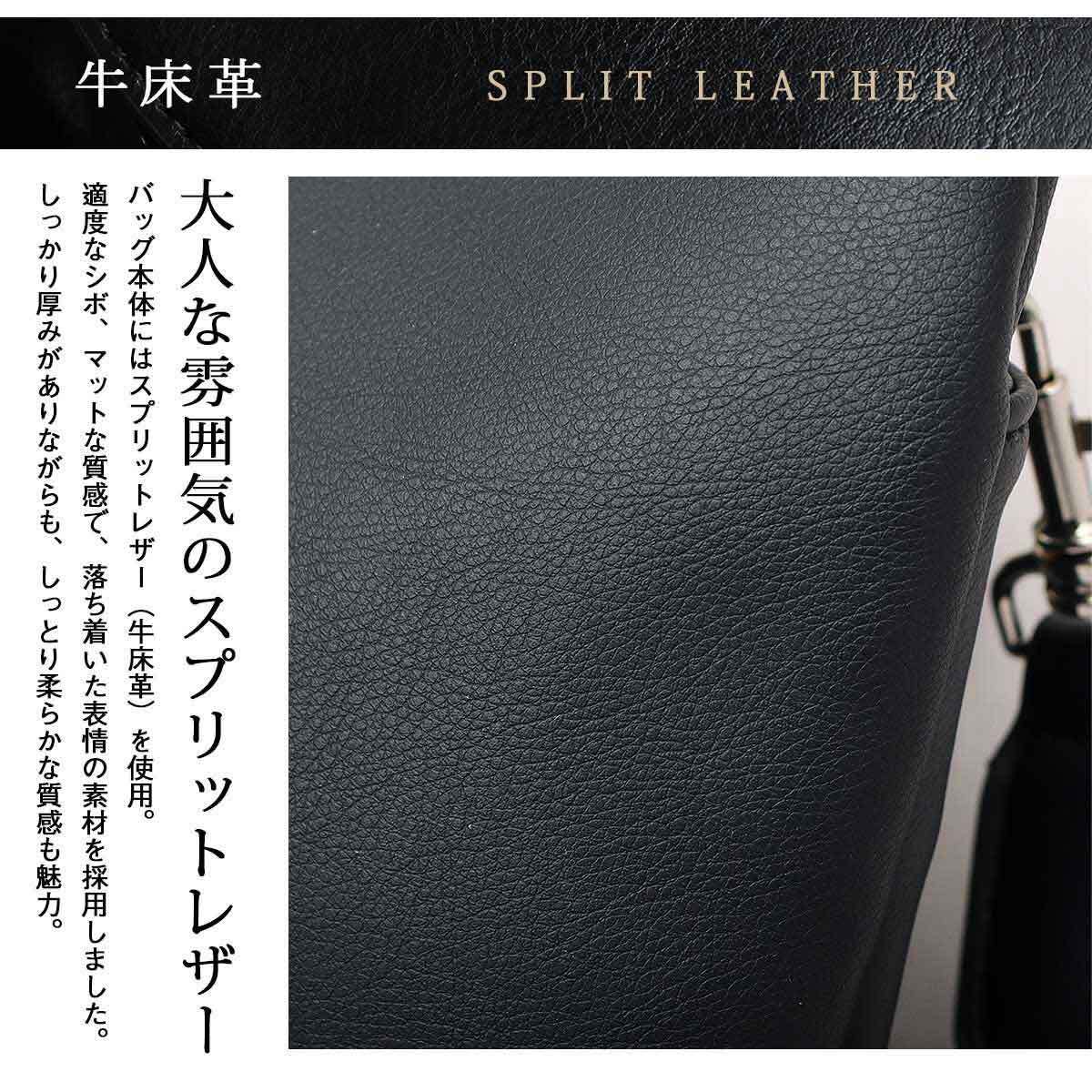 バッグ本体にはスプリットレザー(牛床革)を使用。適度なシボ、マットな質感で、落ち着いた表情の素材を採用しました。しっかり厚みがありながらも、しっとり柔らかな質感も魅力。