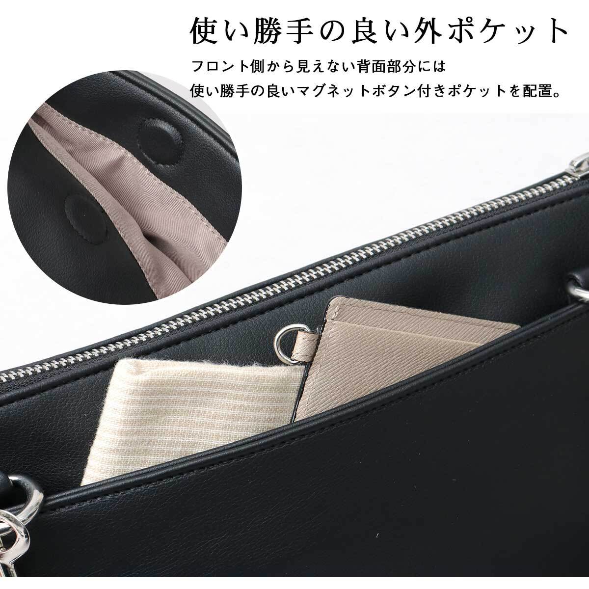 フロント側から見えない背面部分には、使い勝手の良いマグネットボタン付きポケットを配置。