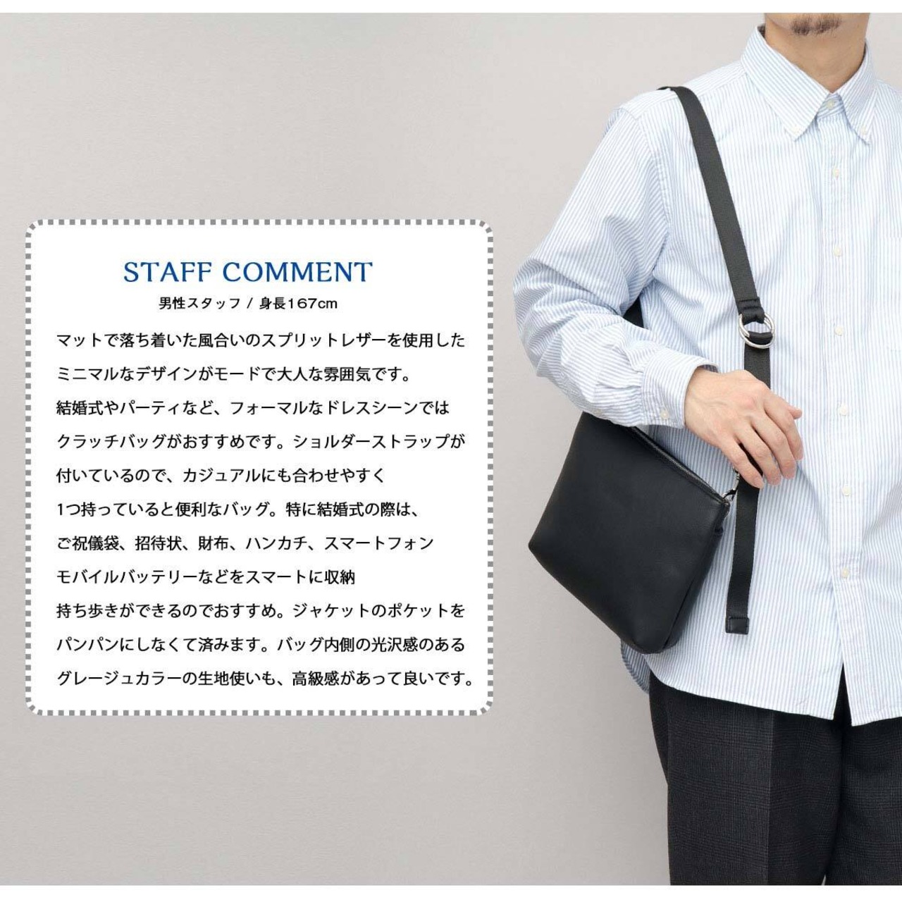マットで落ち着いた風合いのスプリットレザーを使用した、ミニマルなデザインがモードで大人な雰囲気です。結婚式やパーティなど、フォーマルなドレスシーンではクラッチバッグがおすすめです。ショルダーストラップが付いているので、カジュアルにも合わせやすく、1つ持っていると便利なバッグ。特に結婚式の際は、ご祝儀袋、招待状、財布、ハンカチ、スマートフォン、モバイルバッテリーなどをスマートに収納、持ち歩きができるのでおすすめ。ジャケットのポケットをパンパンにしなくて済みます。バッグ内側の光沢感のあるグレージュカラーの生地使いも、高級感があって良いです。