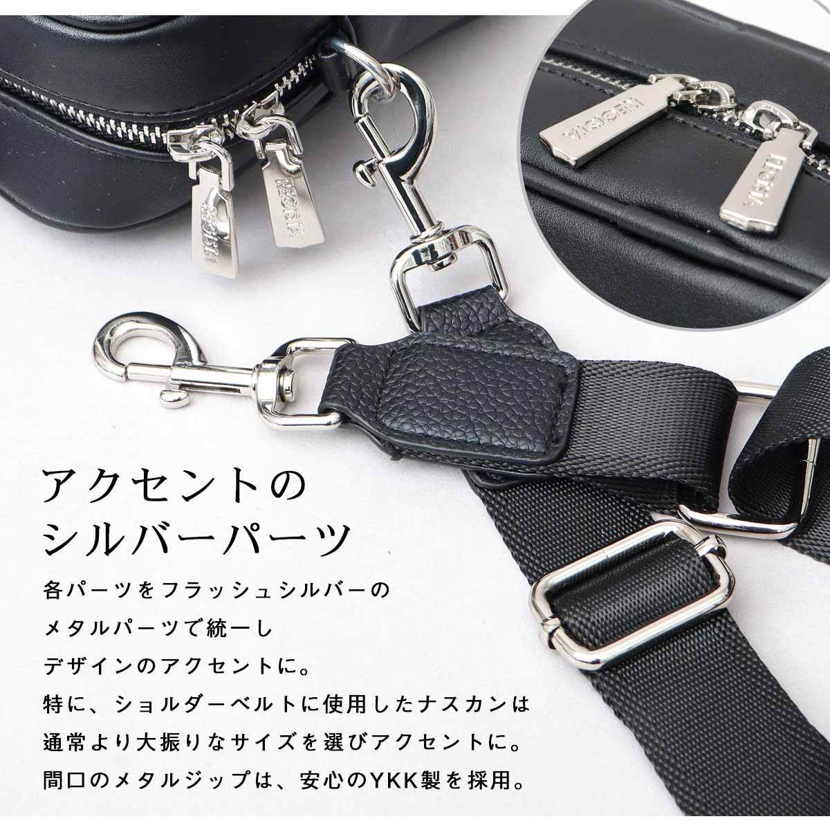 各パーツをフラッシュシルバーのメタルパーツで統一し、デザインのアクセントに。特に、ショルダーベルトに使用したナスカンは、通常より大振りなサイズを選びアクセントに。間口のメタルジップは、安心のYKK製を採用。