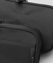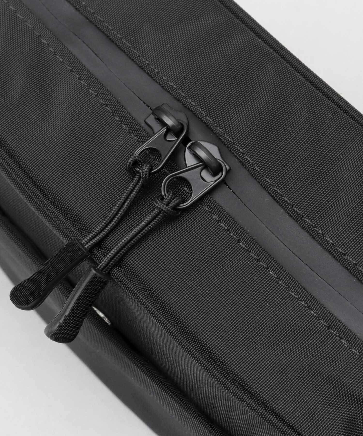 オールブラックで統一された、スタイリッシュかつ都会的なミニマルデザインの『Bed pouch』。サイドに配置したピスタグがさり気ないアクセント。