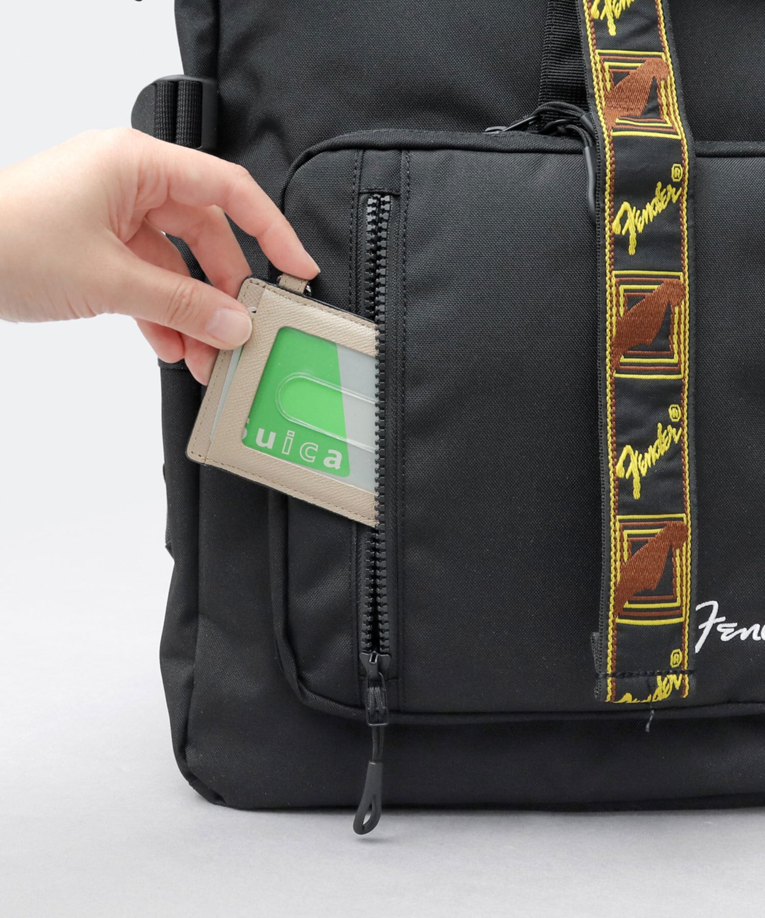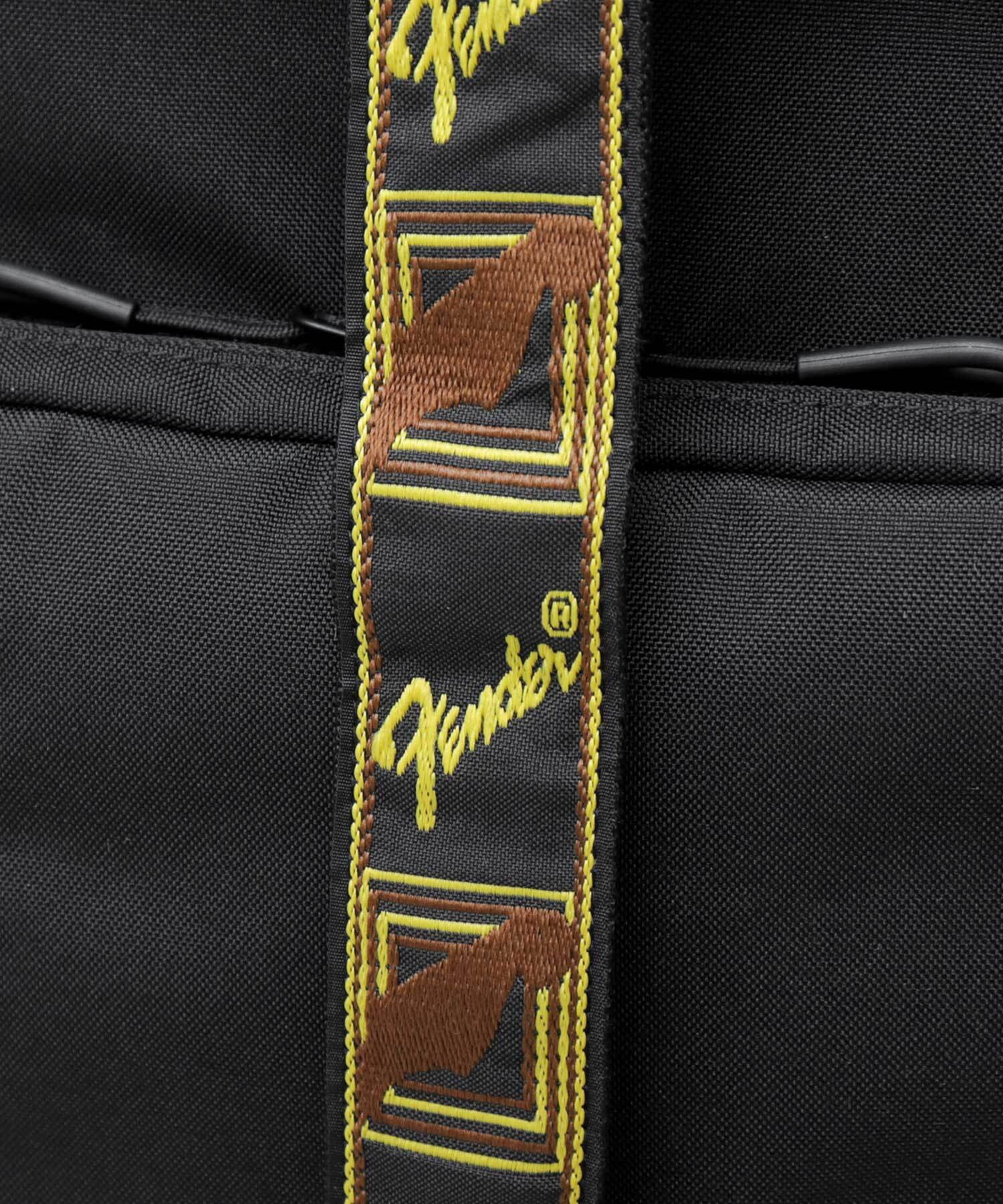 メイン収納スペース間口は、フェンダーのモノグラムストラップを忠実に再現した、ヴィンテージテイストな刺繍テープ使用したバックルとファスナーの二重仕様。刺繍テープは、フェンダーロゴとヘッドストックの刺繍が入った不朽のデザイン。