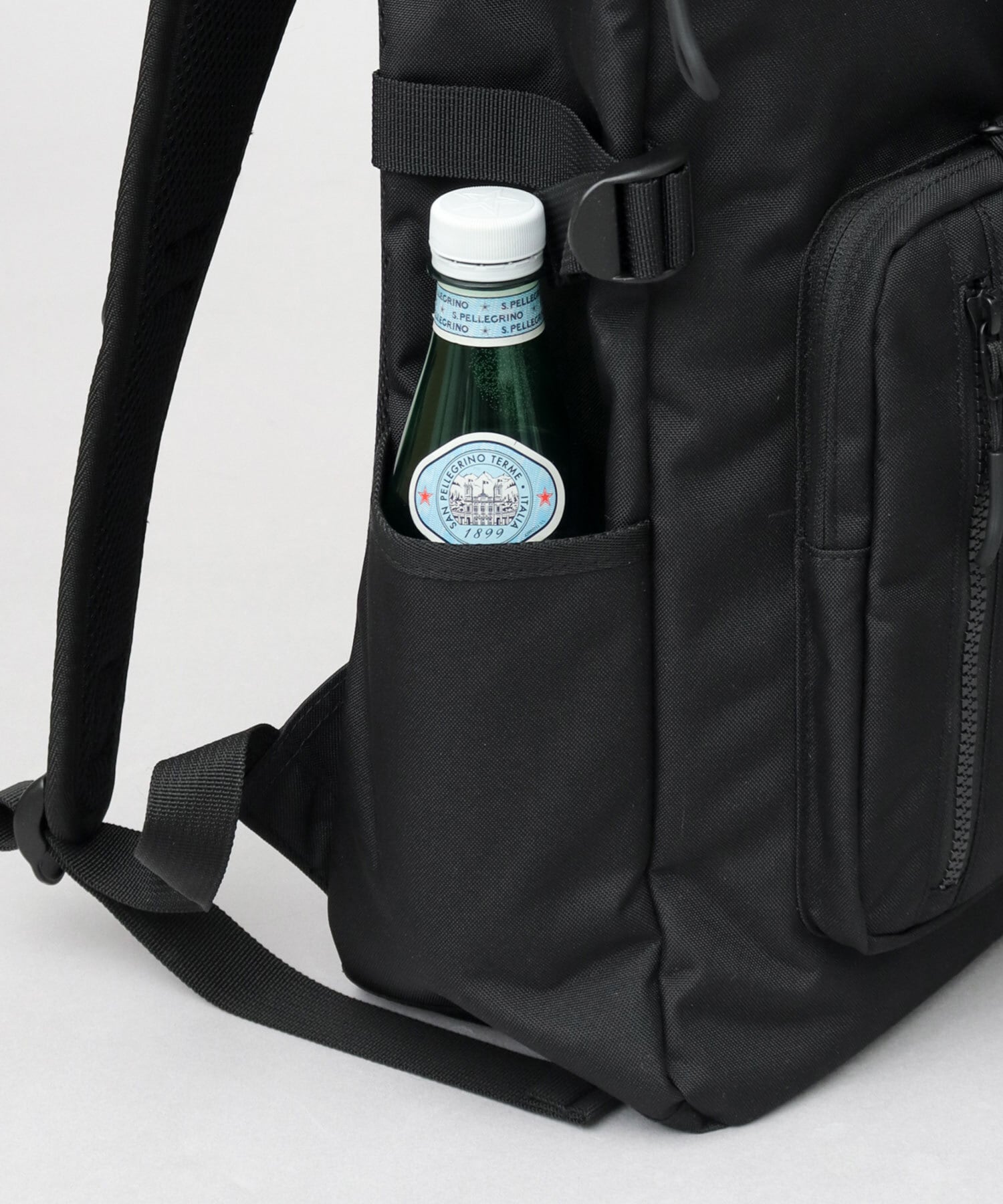 両サイドにペットボトルなどの収納に便利なオープンポケット、背負った際に右側サイドには小物用ファスナーポケットを配置。